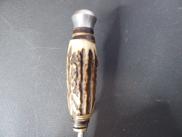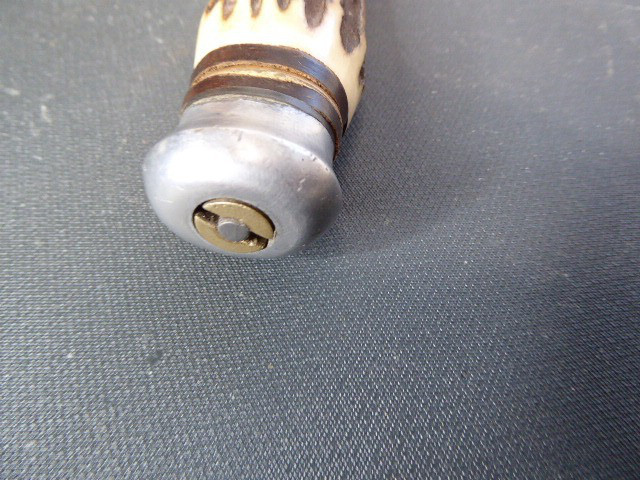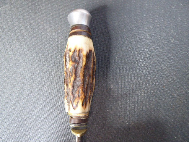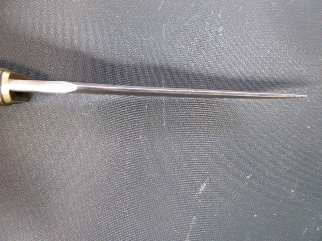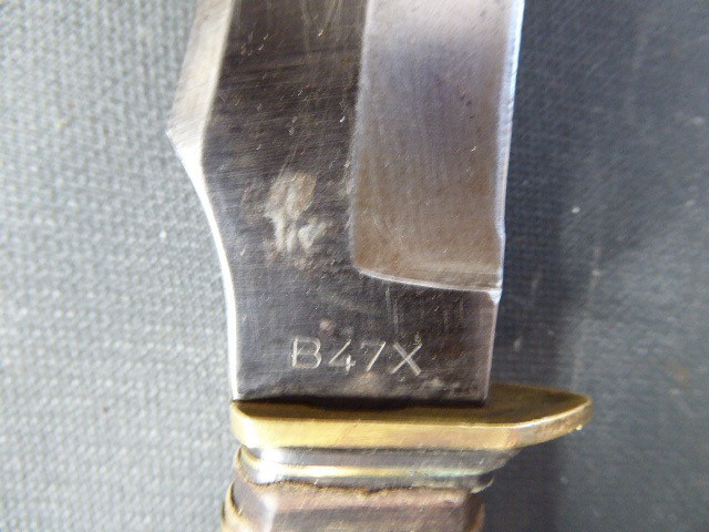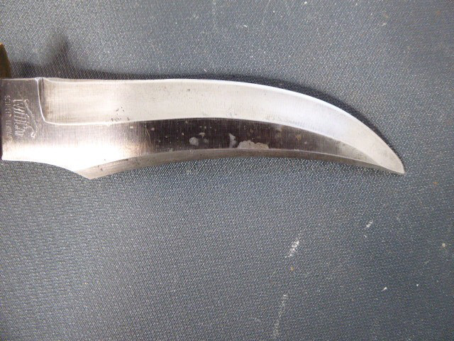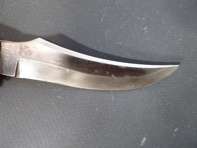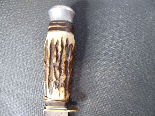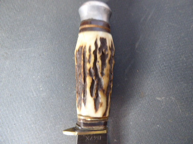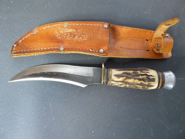 Aus meiner Sammlung gebe ich, ein alten Interessanten Dolch (Skinner) mit Lederscheide Hersteller WILDCAT SOLINGEN GERMANY ab. Griff Original Hirschhorn, Knauf Aluminium, Parierung Messing. Sehr Gut erhaltene Klinge Mit Hersteller WILDCAT SOLINGEN GERMANY und B 47 X Gestempelt. Scheide Leder mit Trageschlaufe und Geprägten Hersteller Logo WILDCAT. Das Teil ist im Guten zu gebrauchenden und Sammelwürdigen Zustand. Alles andere entnehmen Sie Bitte den Fotos. Gesamtlänge: 24,3 cm, ohne Scheide: 23,3 cm, Klingenlänge: 13,2 cm, Klingenbreite: 2,9 cm. Kann zu jederzeit bei mir besichtigt werden. Privatauktion keine Rücknahme und Garantie.