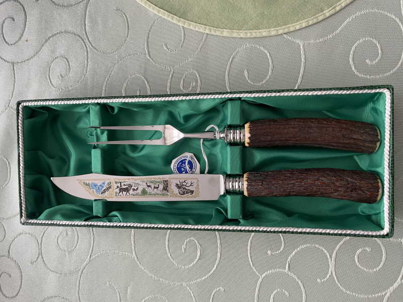 Verkaufe ein sehr dekoratives, jagdliches Tranchier-Besteck Solinger Provenienz mit mit Hirschhorn-Griffen.