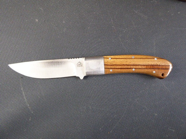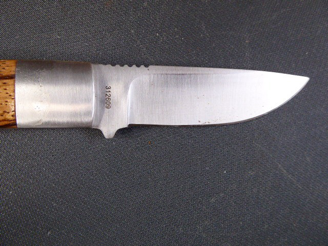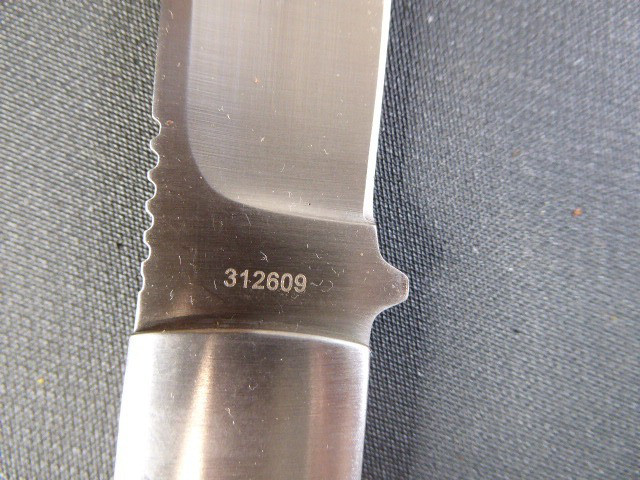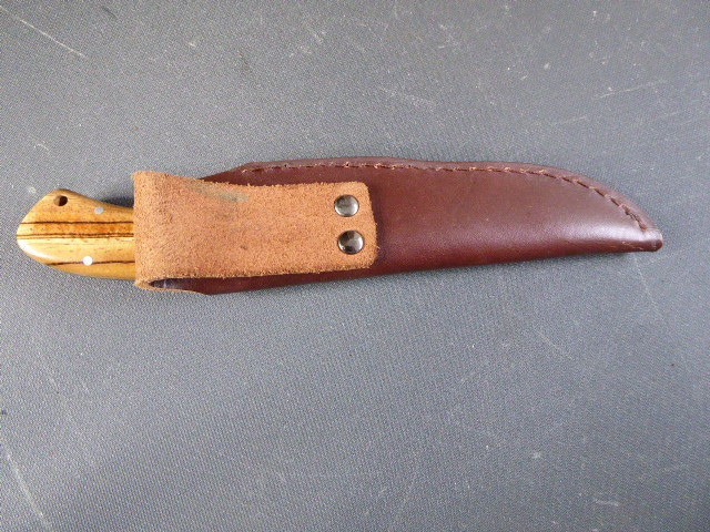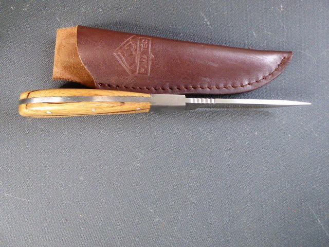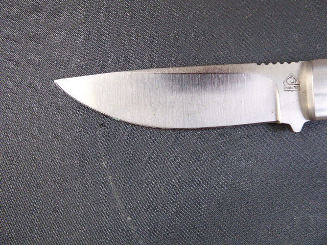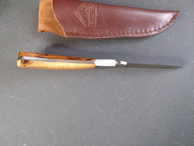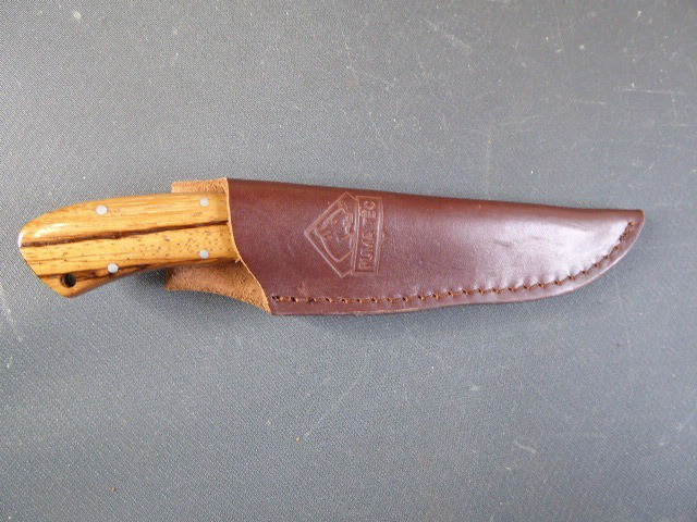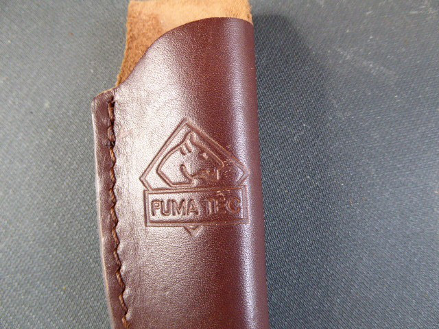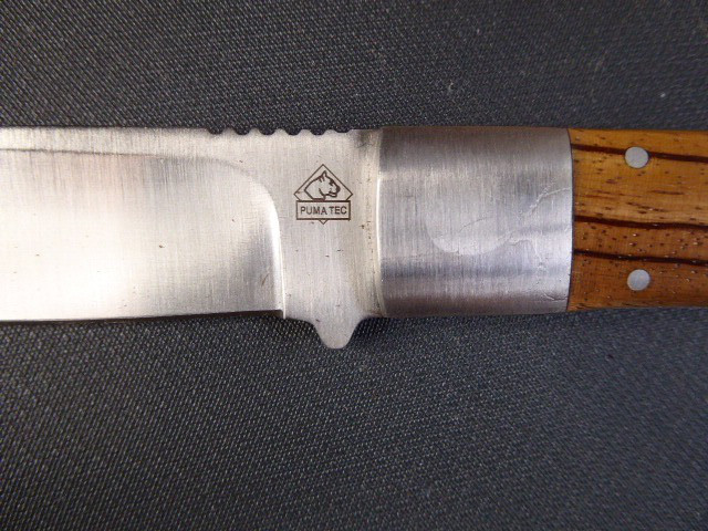 Aus meiner Sammlung gebe ich, ein Seltenes Puma Jagdmesser braune Lederscheide mit Logo Griff helle Holzschalen Herst. PUMA TEC ab. Griff zwei ausgesuchte helle Holzschalen mit 6 Nieten. Sehr Gut erhaltene Klinge einseitig mit Hersteller PUMA TEC und Nr. 31260. Braune Lederscheide mit PUMA TEC Logo geprägten mit Gürtelschlaufe. Das Teil ist im sehr Guten zu gebrauchenden und Sammelwürdigen Zustand. Alles andere entnehmen Sie Bitte den Fotos. Messer mit Scheide: 21,5 cm, ohne Scheide: 20,2 cm, Klingenlänge: 9 cm, Klingenbreite: 2,3 cm. Kann zu jederzeit bei mir besichtigt werden. Privatauktion keine Rücknahme und Garantie.