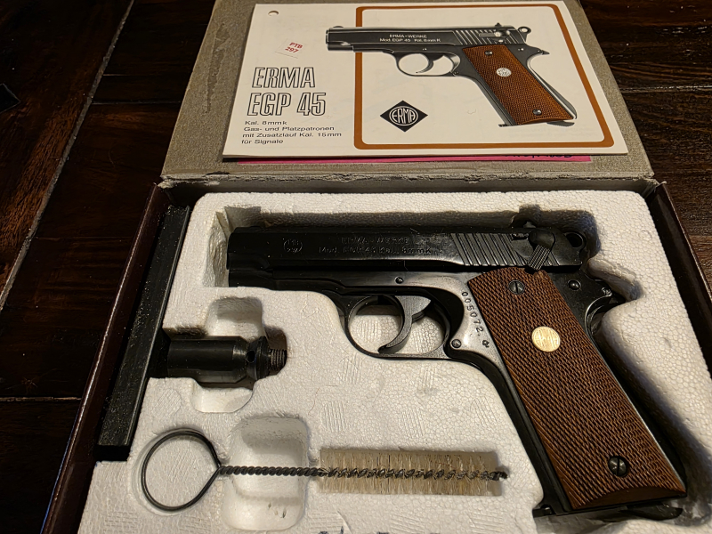 Sie können hier eine Erma EGP 45 erwerben in der originalen Verpackung mit einem Ersatzmagazin und Holzgriffschalen. Das Kaliber ist 8mm k. Die Waffe ist am 01.07.1983 erworben worden. Die Bilder sprechen für sich.Die Vorlage eines Personalausweises ist erforderlich