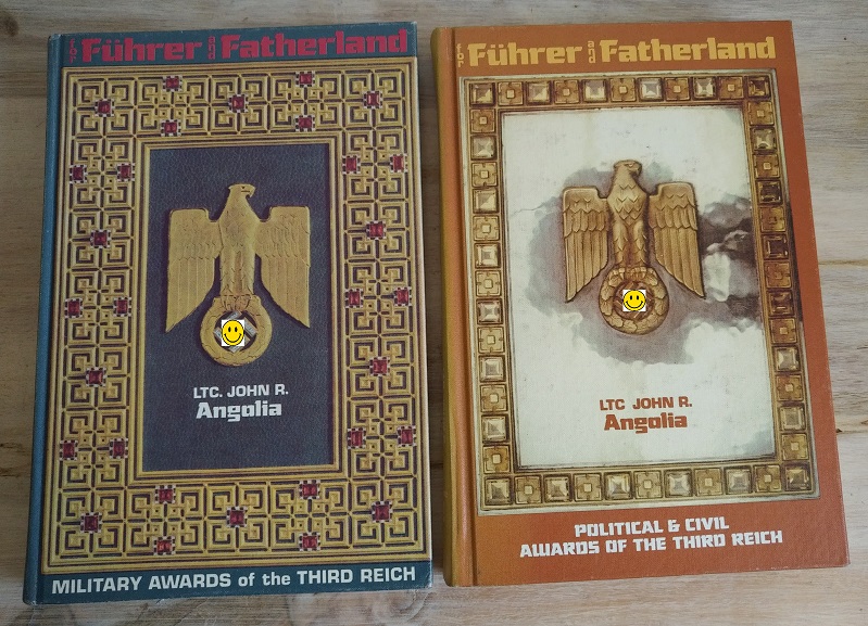 Beide Bände, in der Erstauflage, diese Bücher waren so nie in Deutschland erhältlich: Sie bieten auf zwei Klassiker und Standarwerke über die Orden/Auszeichnungen des III.Reiches, welche in keiner Sammlerhand fehlen sollte: >For Fuhrer and Fatherland: Military Awards of the Third Reich< sowie >For Fuhrer and Fatherland: Political & Civil Awards of the Third Reich< von LTC John R. Angolia. Gebundene Erstauflagen von 1976 und 1978. Eine Fundgrube für Sammler. Hardcover, reich s/w bebildert. 448 und 366 Seiten mit vielen Abbildungen. Die Texte sind nur in englischer Sprache! Illustriert und ausführlich mit anschaulichem Text werden vorliegend die militärischen und politischen sowie zivilen Auszeichnungen des III. Reiches dokumentiert: Angefangen von den Auszeichnungen des Spanischen Bürgerkrieges, den Luftwaffenauszeichnungen, über die Ärmelbänder, dem Eisernen Kreuz, bis hin zu den Produktionen nach dem II. WK. Dabei werden auch die Herstellermarken nicht vernachlässigt und die einwandfreie Identifizierung von Originalstücken. Ein sehr hilfreiches und nützliches Referenzwerk. Die Bücher befinden sich in gebrauchten Zustand. Bei mir haben sie zusammen mit weiteren Fachbüchern in den letzten Jahren nur in einem Stahlschrank gelegen, da ich kaum noch Zeit für das Hobby gefunden habe, jetzt möchte ich es in gute Hände abgeben. Diese Fachbücher sind schon lange nicht mehr zu bekommen und nur noch antiquarisch zu finden. Die Photos ergänzen die Artikelbeschreibung.