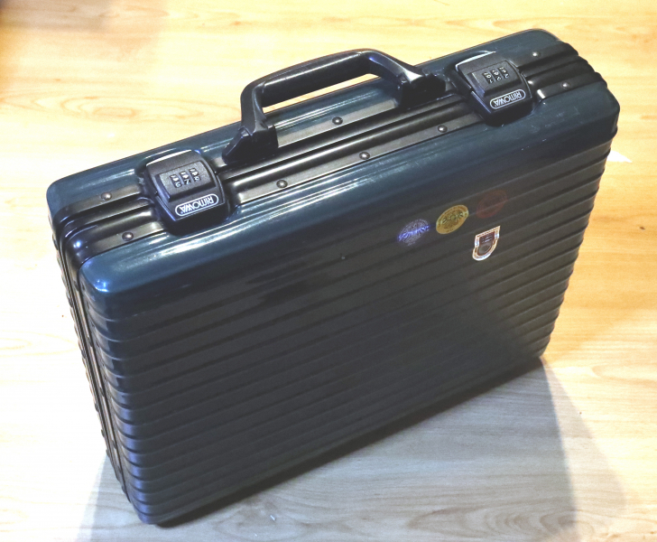Rimowa Koffer für Lupi in dunkelgrünem Kunstoff mit 2 Zahlenschlössern, 45 cm breit und 35 cm hoch, Inhalt Stopuhr, Ohrstöbseö, Reinigungsstopfen, Pelletbox und Savetybox. Stabil und unbeschädigt. Aussparung für Pressluft/CO 2 Patrone und Pistole vorhanden.