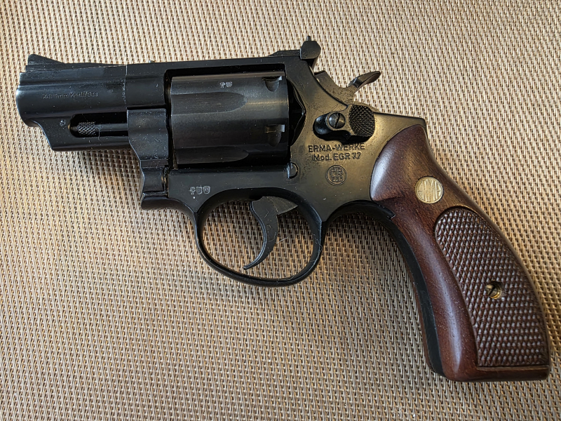 Sie bieten auf einen Erma Revolver EGR 77 mit verschiedenen Griffschalen. Wer mit Sofortkauf beendet erhält die drei abgebildeten Griffschalen dazu. Ersteigert jemand die Auktion kann er sich eine der drei Griffschalen Paare auswählen. Der Revolver ist in einem sammelwürdigen Zustand. Das Korn hat eine klitzekleine Macke Vorlage eines Personalausweises zwingend erforderlich.
