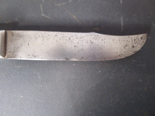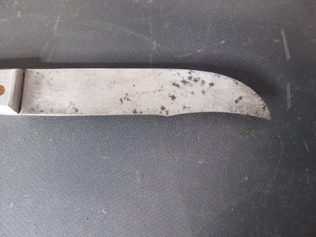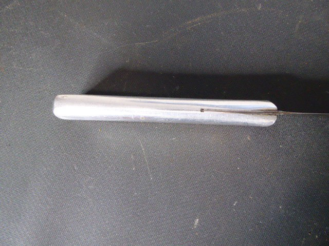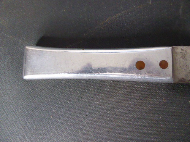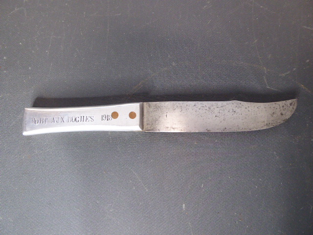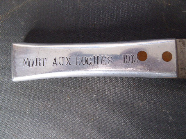 Aus meiner Sammlung gebe ich, ein altes Unbekanntes Messer/ Grabendolch ohne Scheide ab. Griff Aluminium mit Beschriftung, MORT AUX BOGHES 1918. Klinge in Bowie Vorm. Das Teil ist im Guten Sammelwürdigen Zustand. Alles andere entnehmen Sie Bitte den Fotos. Gesamtlänge: 29,3 cm, Klingenlänge: 16,5 cm, Klingenbreite: 3,3 cm. Kann zu jederzeit bei mir besichtigt werden. Privatauktion keine Rücknahme und Garantie.