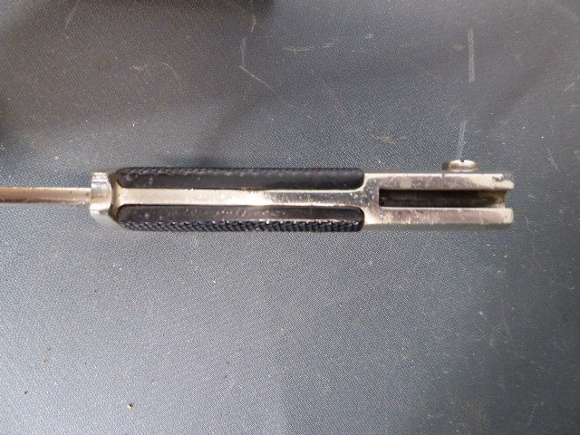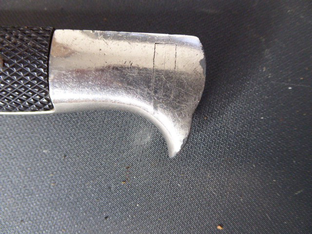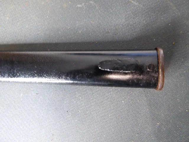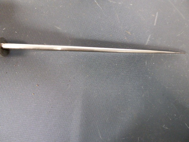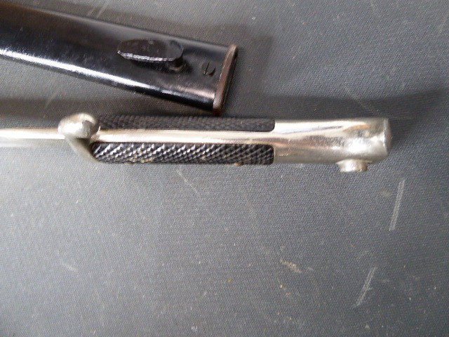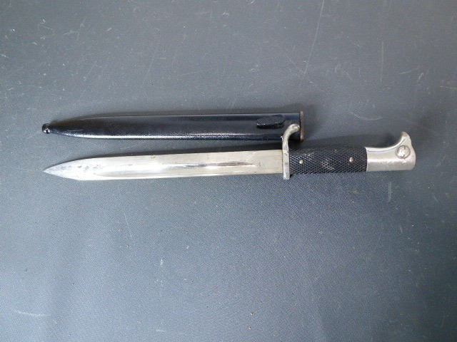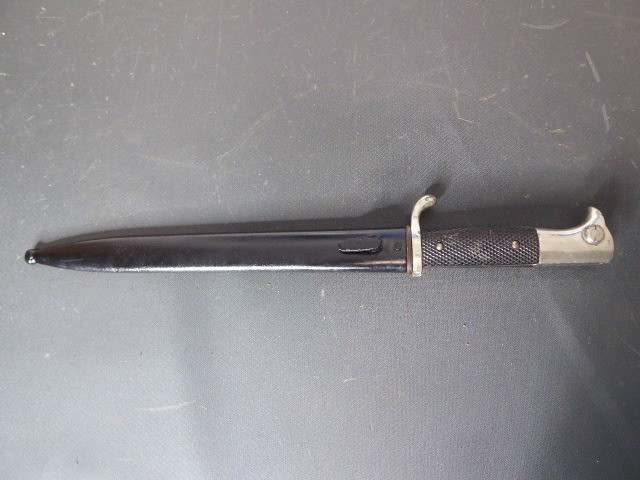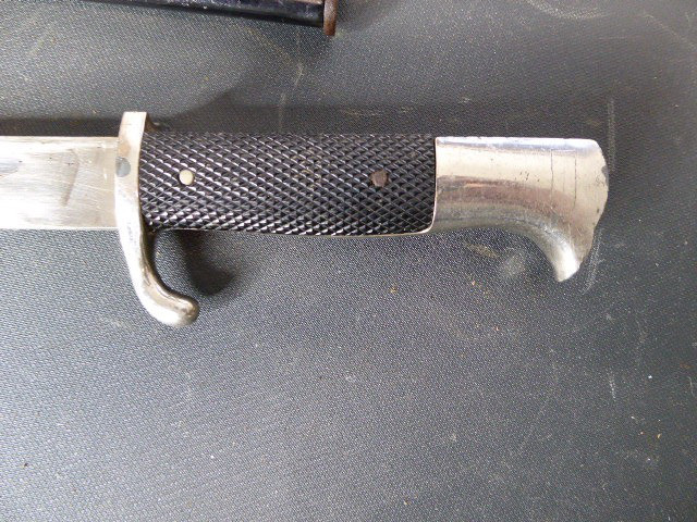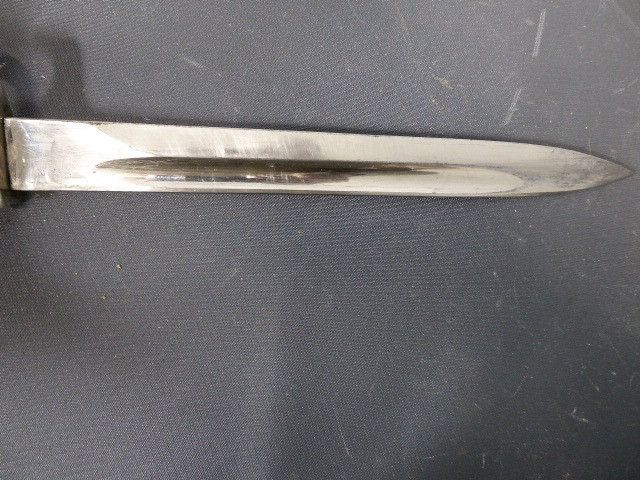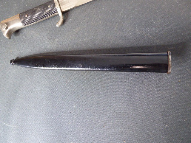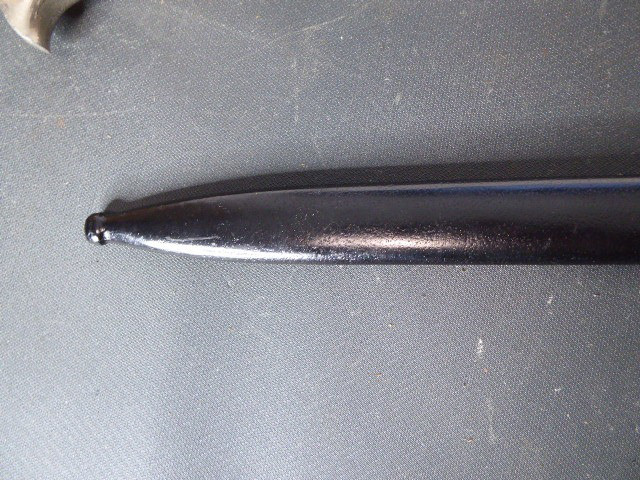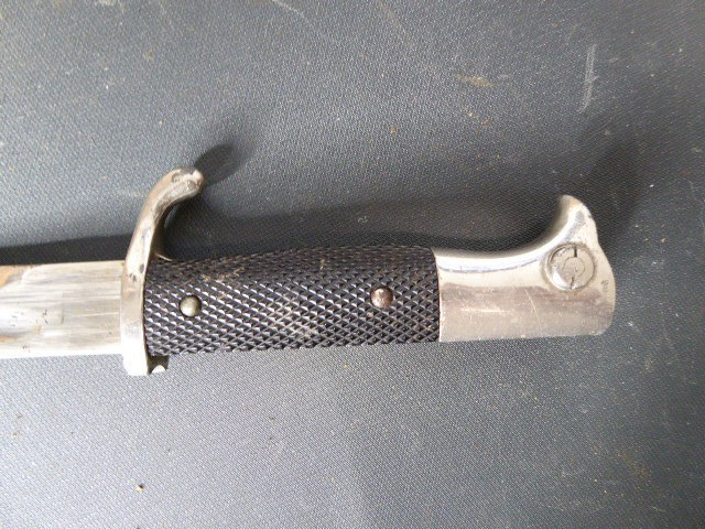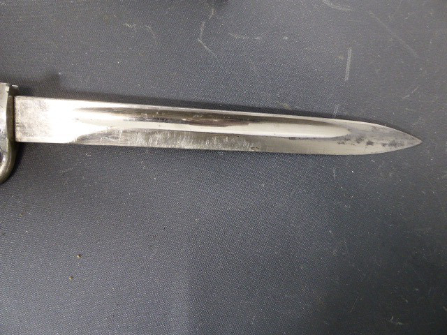 Aus meiner Sammlung gebe ich, ein altes langes 3. Reich Ausgeh Seitengewehr mit Scheide ohne Hersteller ab. Das Teil ist Aufpflanzbar. Scheide wurde mal nachlackiert. Das Teil ist im Guten Sammelwürdigen Zustand. Alles andere entnehmen Sie Bitte den Fotos. Gesamtlänge: 40,1 cm, ohne Scheide: 37 cm, Klingenlänge: 25 cm, Klingenbreite: 2,4 cm. Kann zu jederzeit bei mir besichtigt werden. Privatauktion keine Rücknahme und Garantie.
