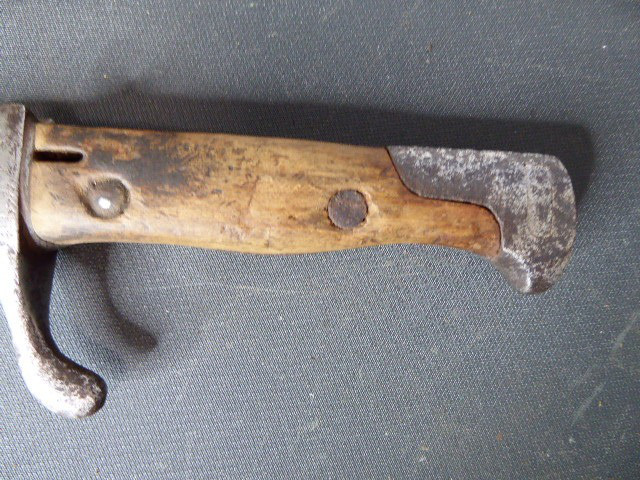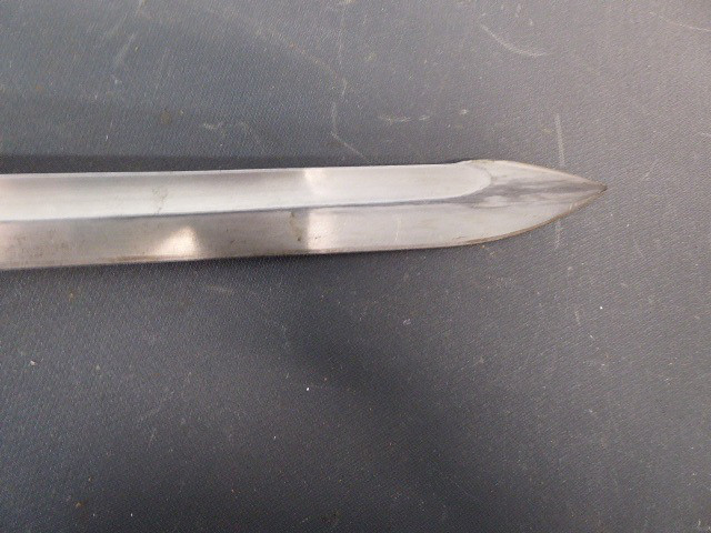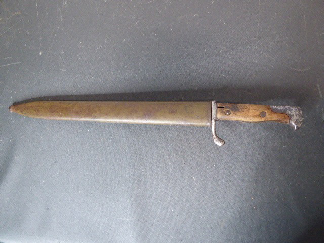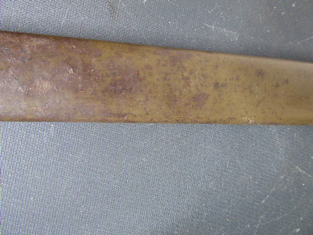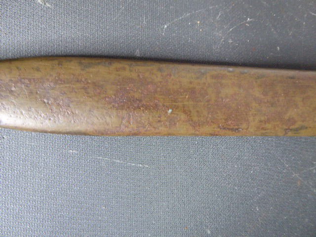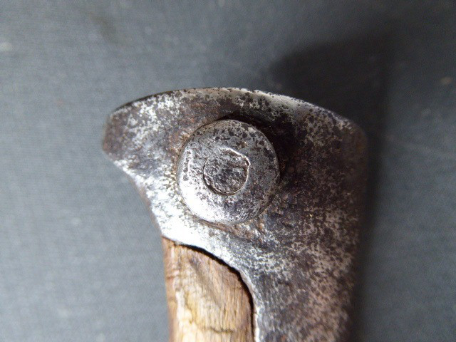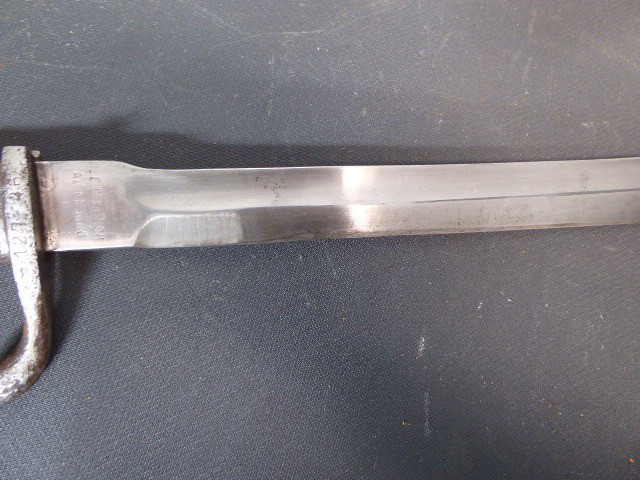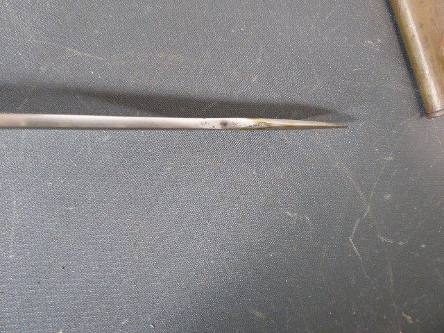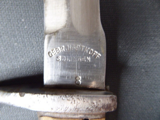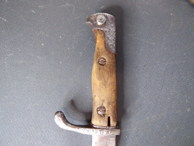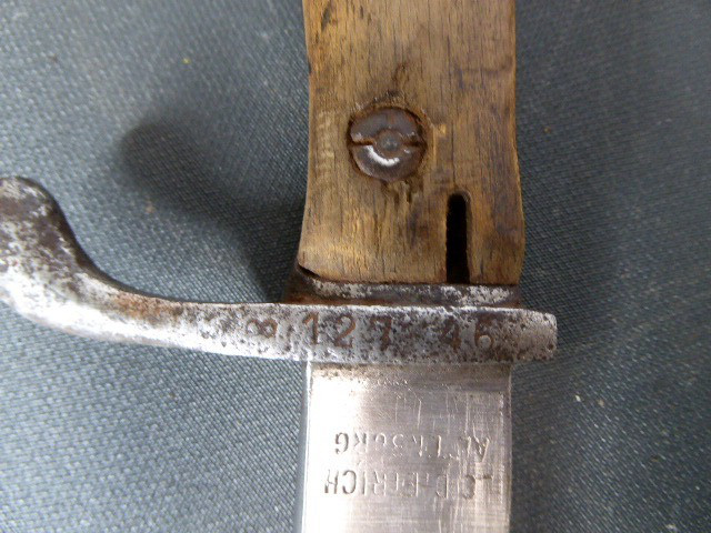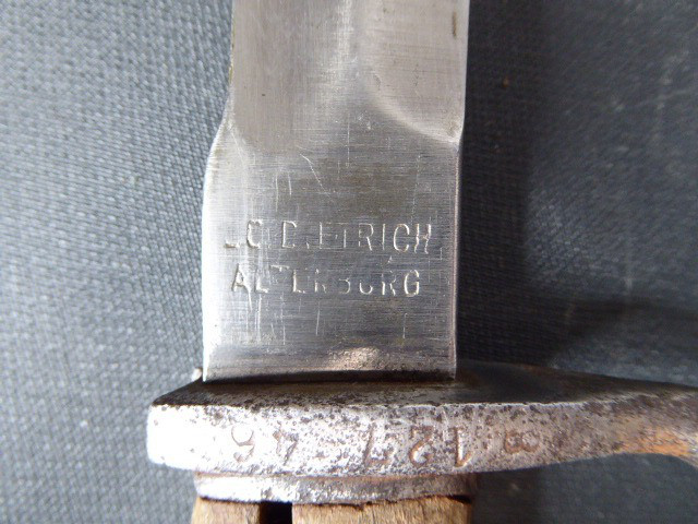 Aus meiner Sammlung gebe ich, ein altes 98/05 Bajo mit ausgeschliffener Säge der Ausschliff mit Punze Scheide Hersteller Kolonien? ab. Griff zwei Holz Schalen, Parierung Regiment Bezeichnung, 8.127 46 Drücker mit Punze und Funktion. Klinge mit ausgeschliffener Säge in dem Ausschliff Gepunzt, Rücken noch mit Krone und Punze, auf der Fehlschärfe Hersteller GEBR. HARTKOPF SOLINGEN darunter 8 gepunzt, auf der anderen Seite, C.C.ETRICH ALTENBURG. Scheide mit grünlichen Original Lack und unten an der Kugel mit Punze. Wahrscheinlich Kolonien, aber Kenner werden es sicherlich wissen wo das Teil getragen wurde. Das Teil ist im Guten Sammelwürdigen Zustand. Alles andere entnehmen Sie Bitte den Fotos. Gesamtlänge: 51,7, cm, ohne Scheide: 50,1 cm, Klingenlänge: 37 cm, Klingenbreite: 2,6 - 3,1 cm. Kann zu jederzeit bei mir besichtigt werden. Privatauktion keine Rücknahme und Garantie.