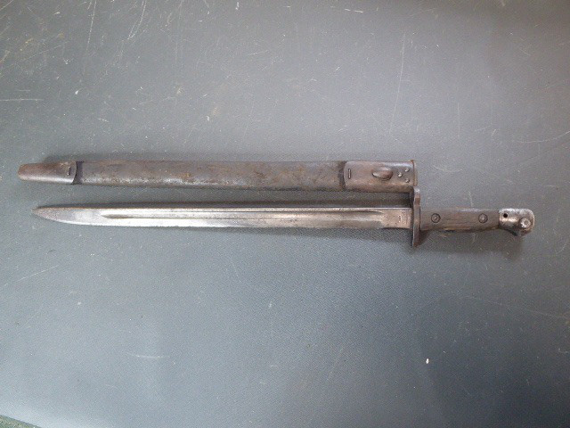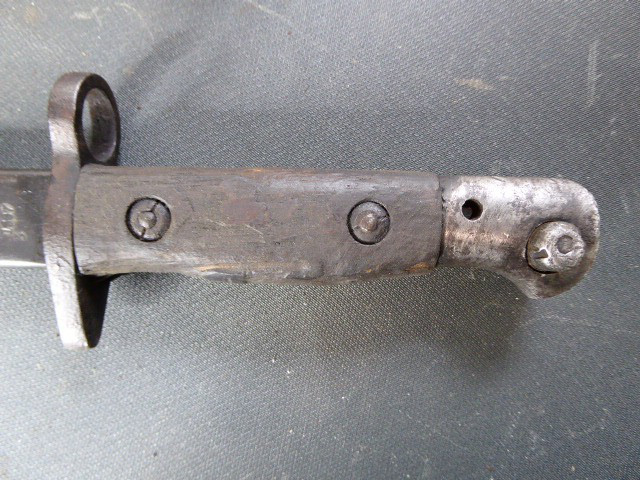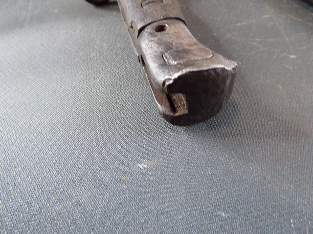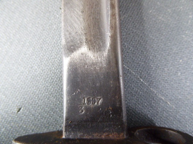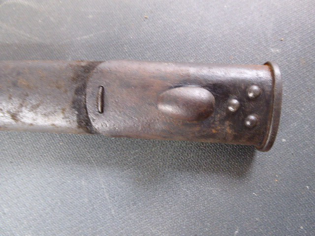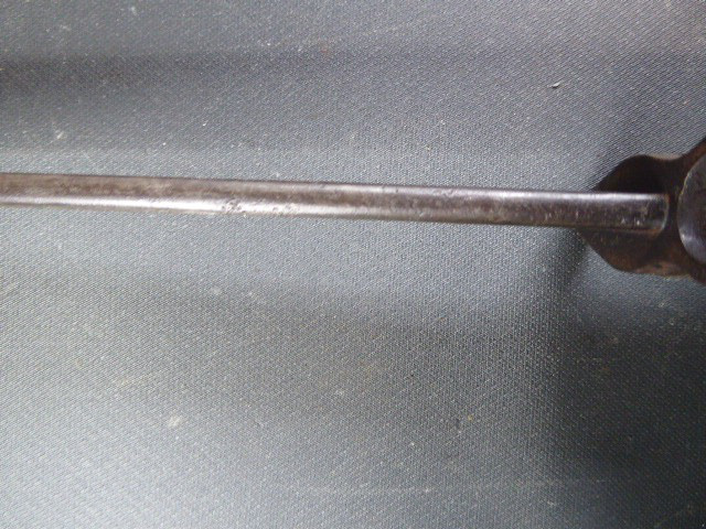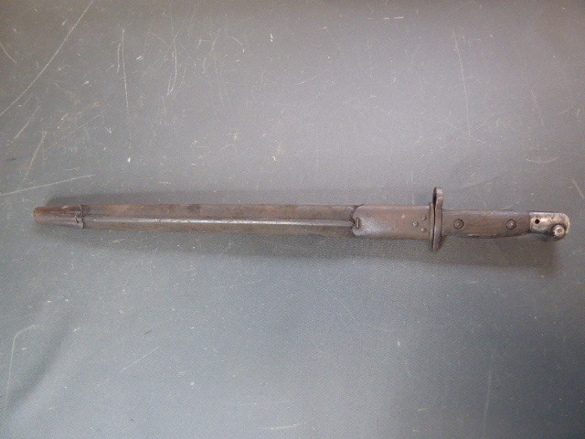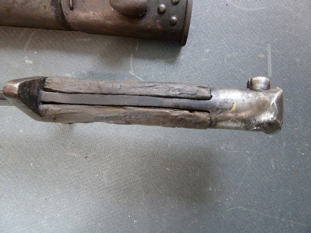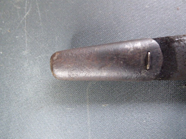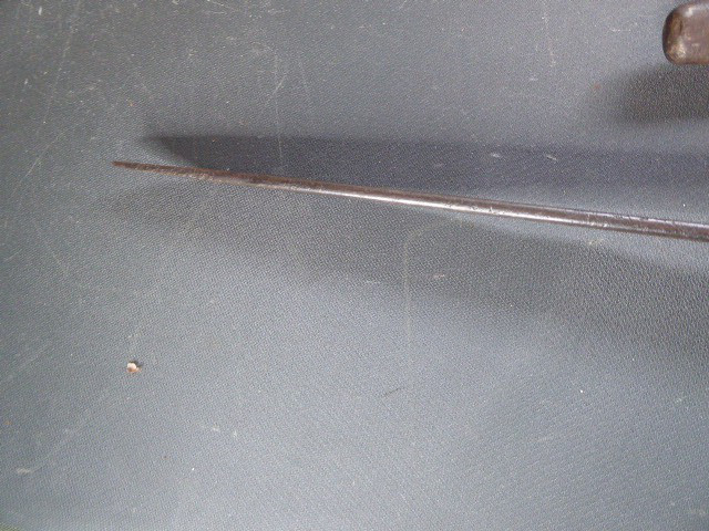 Aus meiner Sammlung gebe ich, ein altes Englisches Bajo 1907 mit Lederscheide ab. Griff Holzschalen die schon Zerschlissen. Drücker mit Funktion. Klinge mit mehreren Stemplungen und 1907, im oberen drittel Klinge Narbig. Lederscheide mit Eisenbeschläge. Das Teil ist im Sammelwürdigen Zustand. Alles andere entnehmen Sie Bitte den Fotos. Gesamtlänge: 58, cm, ohne Scheide: 55 cm, Klingenlänge: 43,2 cm, Klingenbreite: 2,4 cm. Kann zu jederzeit bei mir besichtigt werden. Privatauktion keine Rücknahme und Garantie.