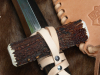 Der ausgesuchte, achteckige Wieseneschen Schaft ist sehr schön gemasert. Er wurde antik Farben gebeizt und mehrfach geölt. Die Wicklung besteht aus Kernleder und wurde mit handgeschmiedeten Pyramiden Kopf Nägeln befestigt. Der echte, rechteckige Hirschhornknebel ist in der Oberflächen Struktur körnig und insofern eine Seltenheit und farblich passend zum dunklen Schaft.