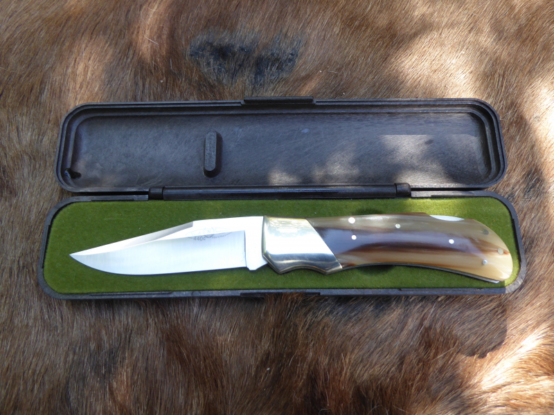 Sie bieten auf ein schönes NIETO Taschemesser aus C 440 Stahl mit gemasertem Griff und poliertem Messing Heft. Die Klinge hat einen leichten Hohlschliff und am vorderen Teil des Klingenrückens eine Fehlschärfe. Die Gesamtlänge beträgt 21 cm, die Klingenlänge beträgt 9,5 cm, Klingenstärke beträgt 3 mm. Im Lieferumfang ist die original Hartplastik Kiste enthalten.