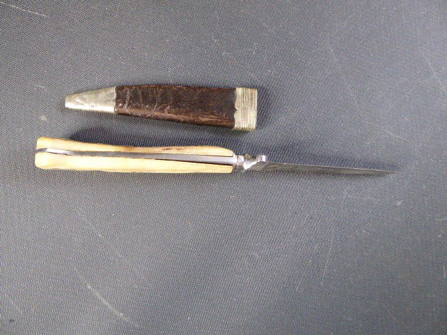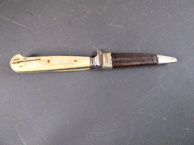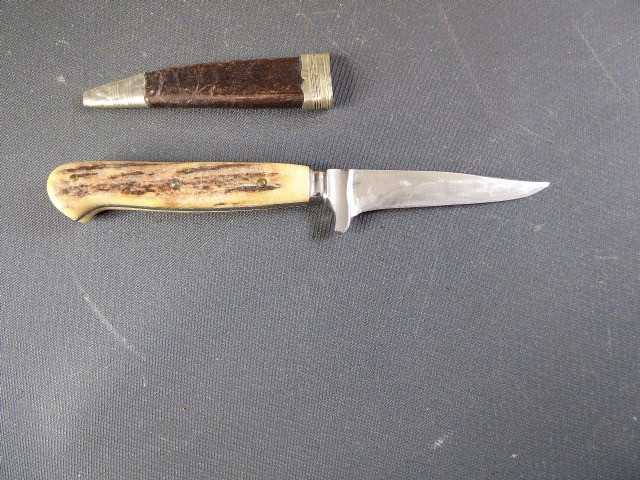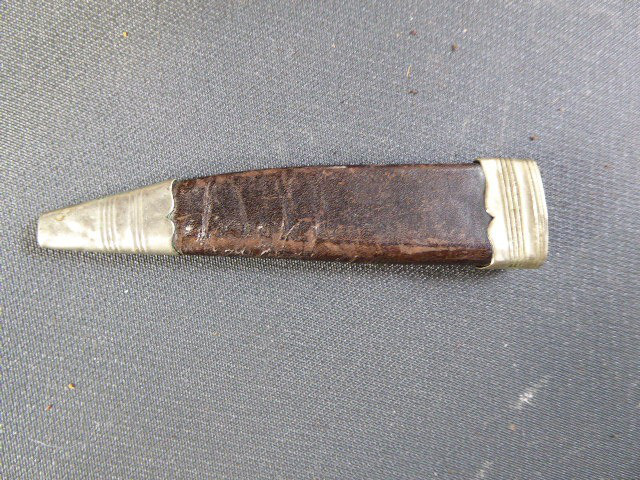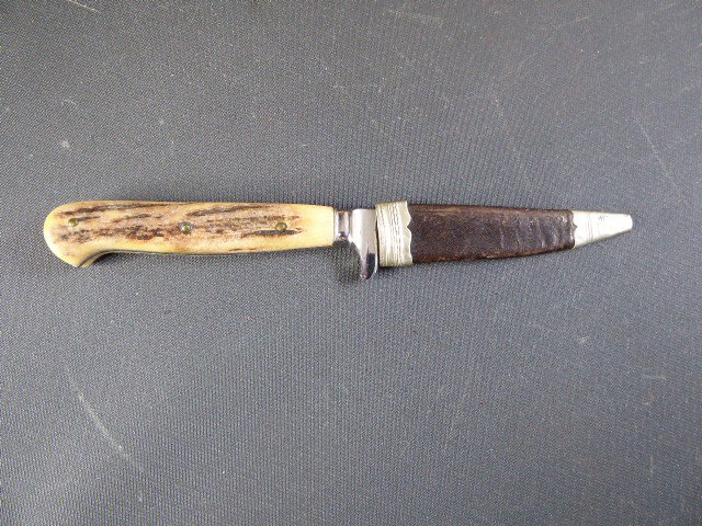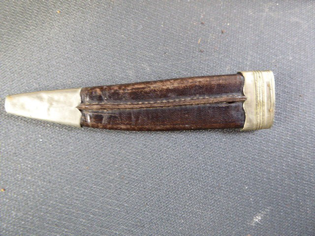 Alter Jagdnicker Hirschhornschalen ohne Hersteller Lederscheide mit Neusilber Beschläge