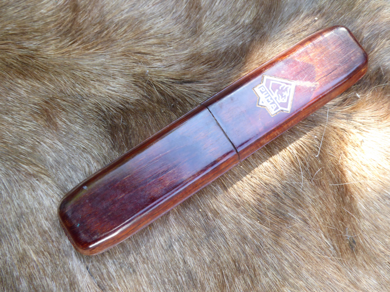 Sie bieten auf ein original PUMA Behältnis, zweiteilig, zum Zusammenschieben. Wahrscheinlich gedacht für ein Rasiermesser. Es ist 17,5 cm lang, 3, cm breit und 2 cm hoch, alles in allem noch gut erhalten. Mit eingelassem PUMA Logo an der Oberfläche.