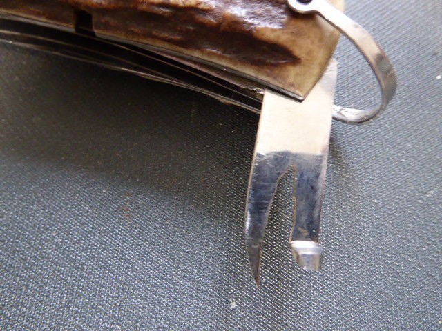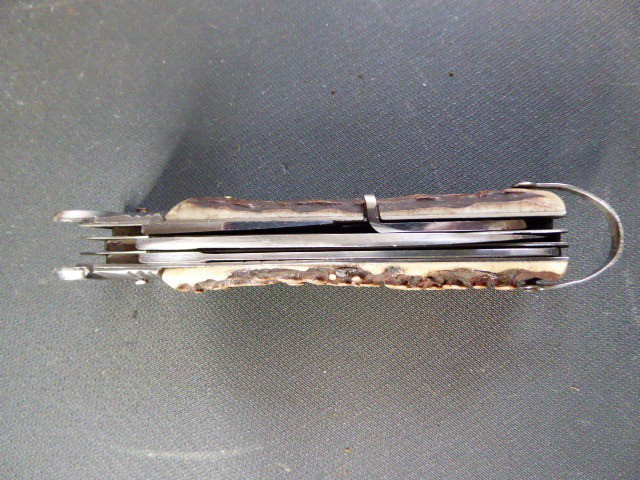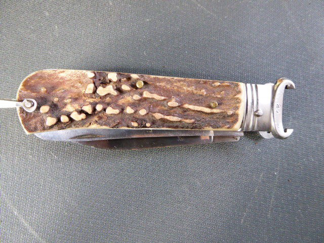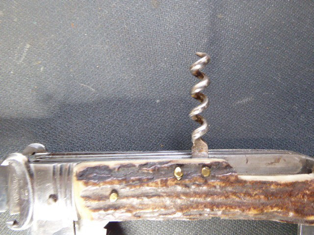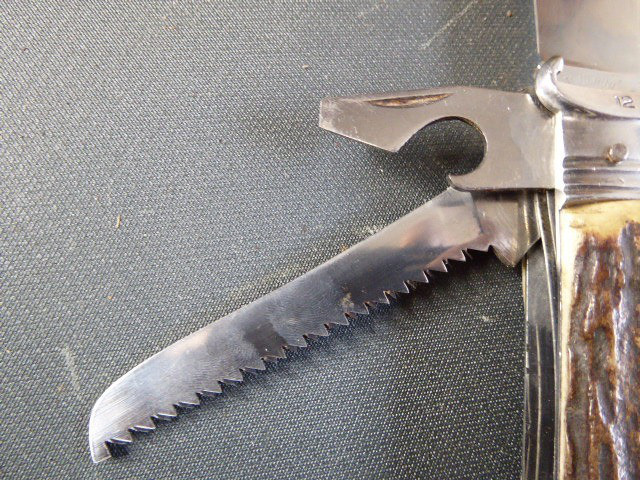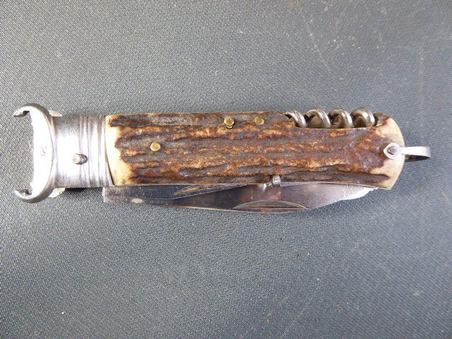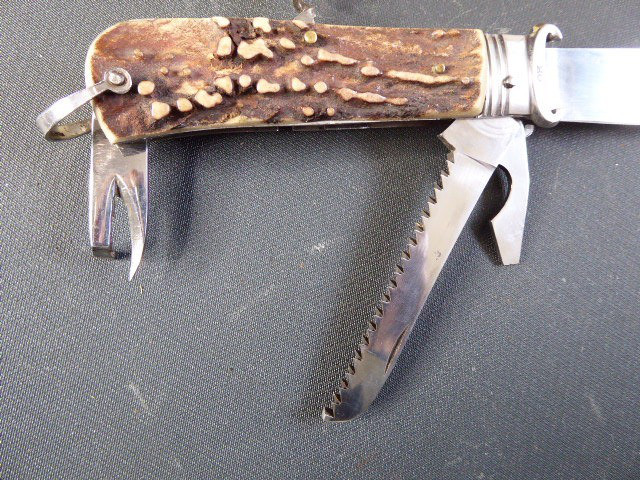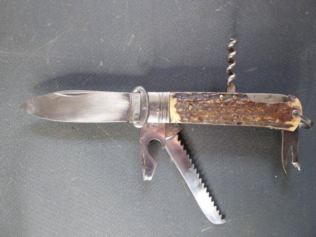 Aus meiner Sammlung gebe ich, ein altes Großes Jagdtaschenmesser 5 Funktionen und 2 Patronenzieher Herst. TONERINI SCARPERLA ab. Griff zwei originale Hirschhornschalen. Patronenzieher für Kaliber 12 und 20. Gut erhaltene Klingen. Das Teil ist im sehr Guten zu gebrauchenden und Sammelwürdigen Zustand. Alles andere entnehmen Sie Bitte den Fotos. Taschenmesser geschlossen: 12,2 cm Geöffnet mit Klinge: 19,8 cm, Klingenlänge: 7,5 cm, Klingenbreite: 2,2 cm. Kann zu jederzeit bei mir besichtigt werden. Privatauktion keine Rücknahme und Garantie.