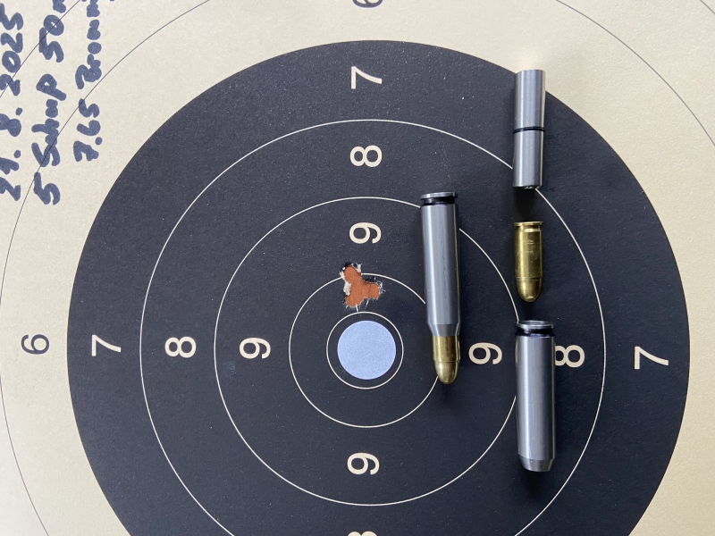 Ich habe die Reduzierhülse auf dem Schießstand getestet mit einem Repetierer gutes Schußbild siehe Bild 50 M