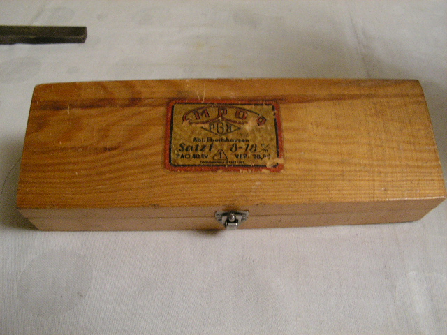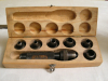 Großer Profilocheisensatz aus bester hochwertiger DDR Produktion, 8 - 18 mm, schöner Holzkasten, gefederter Zentrierdorn wie es sich gehört, Pipes leicht nachschärfbar.