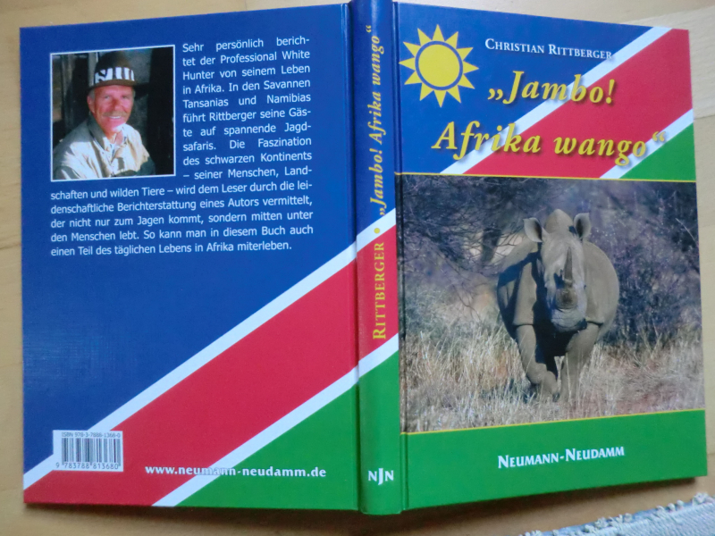 "JAMBO! AFRIKA WANGO" - von Christian Rittberger, Verlag Neumann-Neudamm 2011, 226 Seiten mit vielen farbigen Abbildungen - Inhalt u.a.: Afrka, ein erster Besuch! / Notizen zur Jagd in Namibia / Kirchgang und ein Nachtbummel in Windhuk / Notizen zur Jagd in Tansania / Krokodiljagd am Mgeta River / Reisen ins Ovamboland / Mizaki, eine afrikanische Weihnachtsgeschichte / und anderes mehr - Guter bis sehr guter Zustand