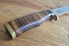 Spiegelpolierte 5mm dicke Klinge, Messingguard, die Stahlsorte ist mir nicht bekannt, ebensowenig die Holzsorte der Griffschalen.