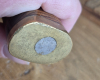 Unbenutzt, nicht nachgeschärft. Leichte Lagerspuren sind vorhanden, wer mit dem Mikroskop sucht, um später nachzuverhandeln, sollte hier nicht bieten. Messing ist angelaufen. Irgendein Honk hat das Messer mal als Hammer benutzt, am Griffende sieht man noch Spuren davon, der Griff sitzt aber noch bombenfest, das Messer kann bedenkenlos benutzt werden. Ansonsten ein top Messer, das super in der Hand liegt und auch härtere Behandlung verträgt.