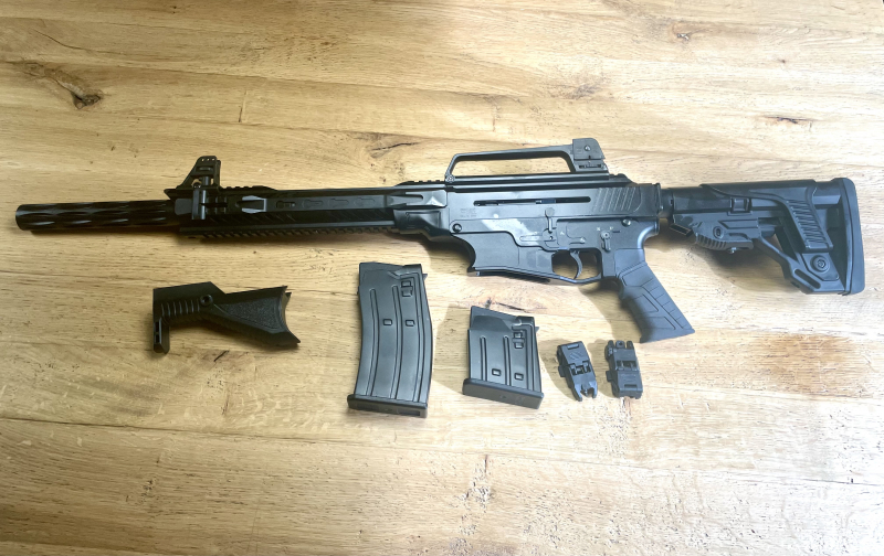 Ebenso ein Choke Set, Flip up Visierung und Griff vorne sowie Kunststoff Waffenkoffer