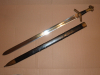 Mit blanker, scharfer 40 mm breiter Klinge, gestempelt "Windlass Marto". Länge 94,5 cm, Klinge 79 cm, ca 1,5 kg schwer ohne Scheide. Sauber verzierte Lederscheide, der Griff ist massives Messing mit Leder in der Mitte.
