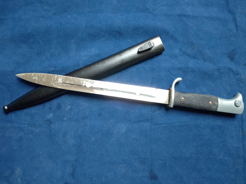 Aus Sammlungsauflösung stammt dieses mir so unbekannte Bajonett, beide Griffschalen intakt original vernietet, Klinge mit Eickhorn Solingen, Klinge auf der Vorderseite mit Devisenätzung der Schutzstaffel geätzt nicht gelasert, Scheide nachlackiert Mundblech fehlt, insgesamt interessante Stück da mir unbekannt aber ohne Obligo zum fairen Startpreis ab einem Euro