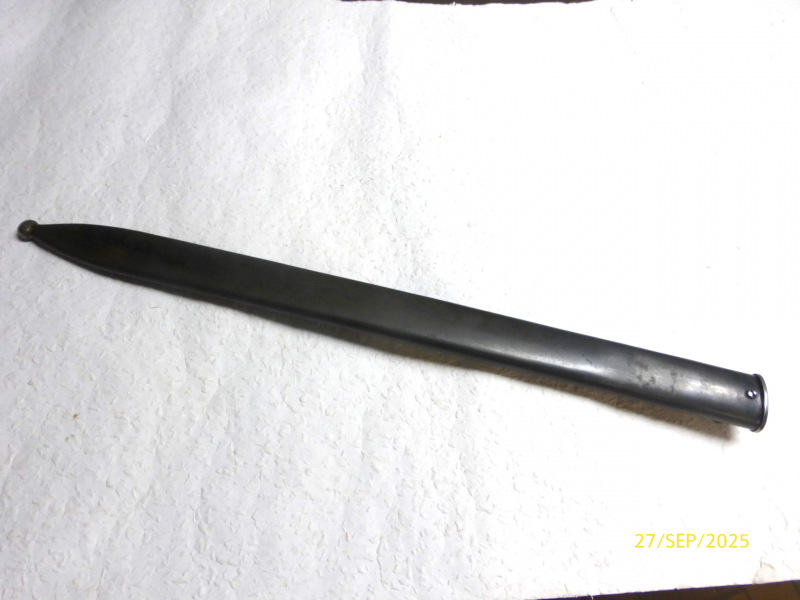 Sie bieten auf eine original Bajonettscheide, Art und Verwendung ist mir nicht bekannt. Wohl Schweiz, da auf der Kugel mit einem Kreuz gestempelt. Sowie typischer Lederriemen Schweizer Bajonette. 1878? Gesamtlänge 51cm - Klingenlänge 47,5cm - Maximale Breite außen, oben 37,0mm nach unten verjüngt auf ca. 35mm - innen max. Breite 31,5mm, siehe Bild. 2x mit großen P gestempelt. Gewicht 345g