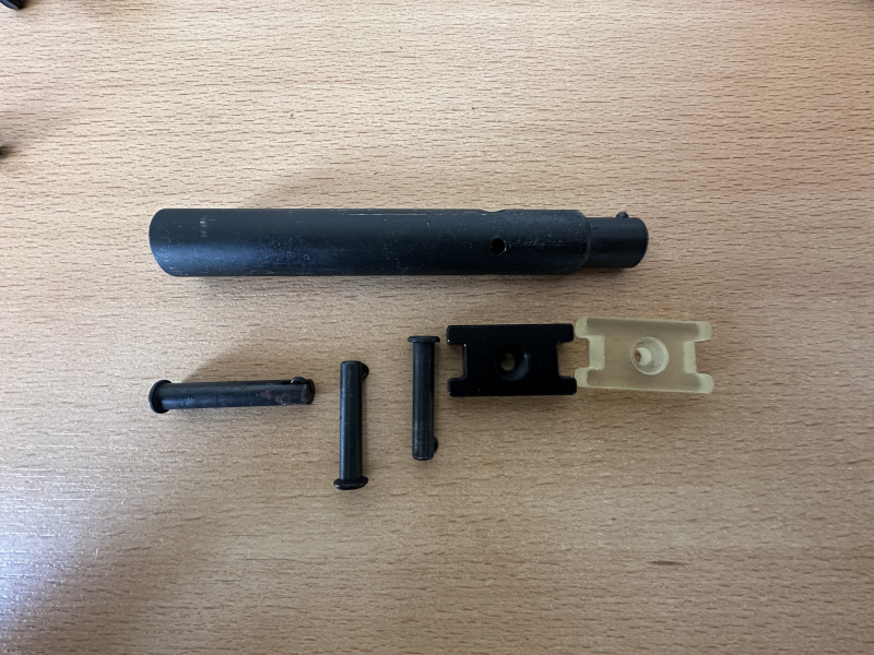 Heckler&Koch MP5 Ersatzteile aus 2008 Deko Waffe. Sind meine letzten Teile und können weg. Gehäusebolzen sind noch alle heile und vollständig. Die Buffer sind aus Gummi und Alu und das Durchladerohr ist auch aus Alu.