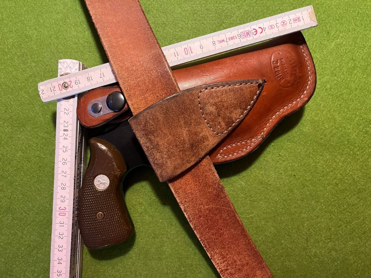 Jagd und privat, das Holster kann außer das angegebene für Modelle und Nachbauten von 5 und 6- schüssige Revolver mittlerer J und K- Klasse mit 2,5 bis 3,0 Zoll Lauf im 38spl/357Mag.- Kaliber wie z.B. Colt Cobra