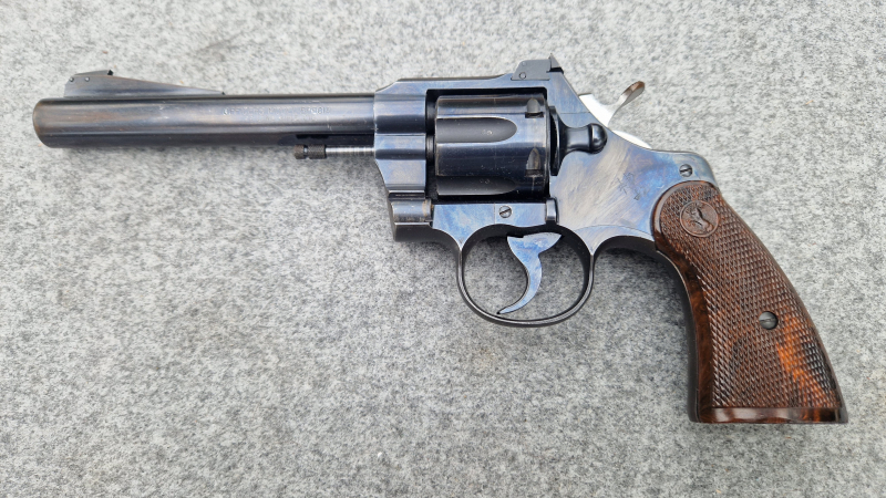 Colt Officers Model Special. Kaliber .22 lr, Brüniert, 6 Zoll Lauflänge , schwerer Matchlauf (Bullbarrel), verstellbare Visierung, Target-Hahn. Original Griffschalen. Britischer Beschuss, british proofmarks..... ......Der Colt Officers Model Special ist einer der seltensten Colts. Nur zwischen 1948 und 1950 gefertigt. Dieser hier ist aus 1950. Der OMS ist ein Transition Model zwischen den Vorkriegs-Officers Models und dem ab 1951 gefertigten Officers Model Match. Lauf, Trommel, Hahn und Visier wurden von Colt nie wieder so produziert. Meines Wissens wurde hier in Egun noch nie ein OMS angeboten...........Verkauf von Privat unter Ausschluss jeglicher Sachmängelhaftung und Gewährleistung. Keine Rücknahme des Artikels. Zahlung und Abnahme nach Auktionsende. Kein Versand ins Ausland. ......... Foreign bidders: I don't offer export. If you buy, you have to organize export through a german gun dealer of your choice.