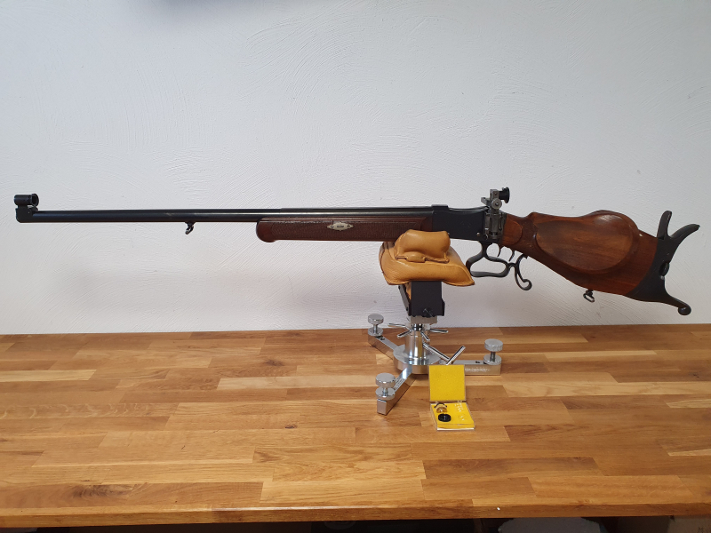 Lauflänge ca. 80 cm. Gesamtlänge ca. 130 cm. Gesamtgewicht ca. 8kg. Sehr schwere und präzise Büchse. Widderkopf Schaft, mit Daumenauflage, rechts. Waffe mit Diopter Visier. Inkl. ahg Ringkorn-Set. System - Fallblockbüchse, Falling - Block, Feuerstutzen, Zimmerstutzen, Scheibenbüchse. Ohne weiteres Zubehör.