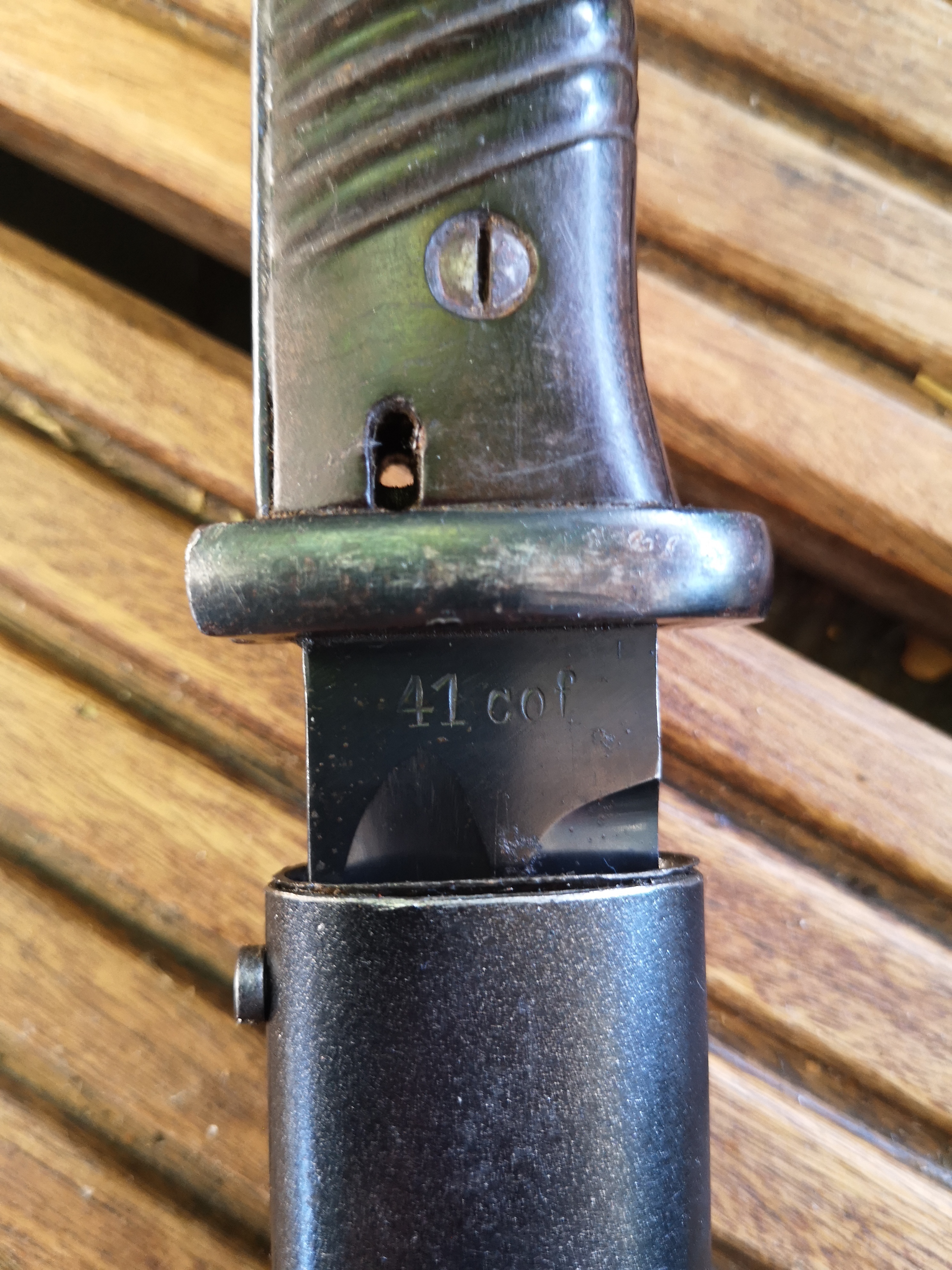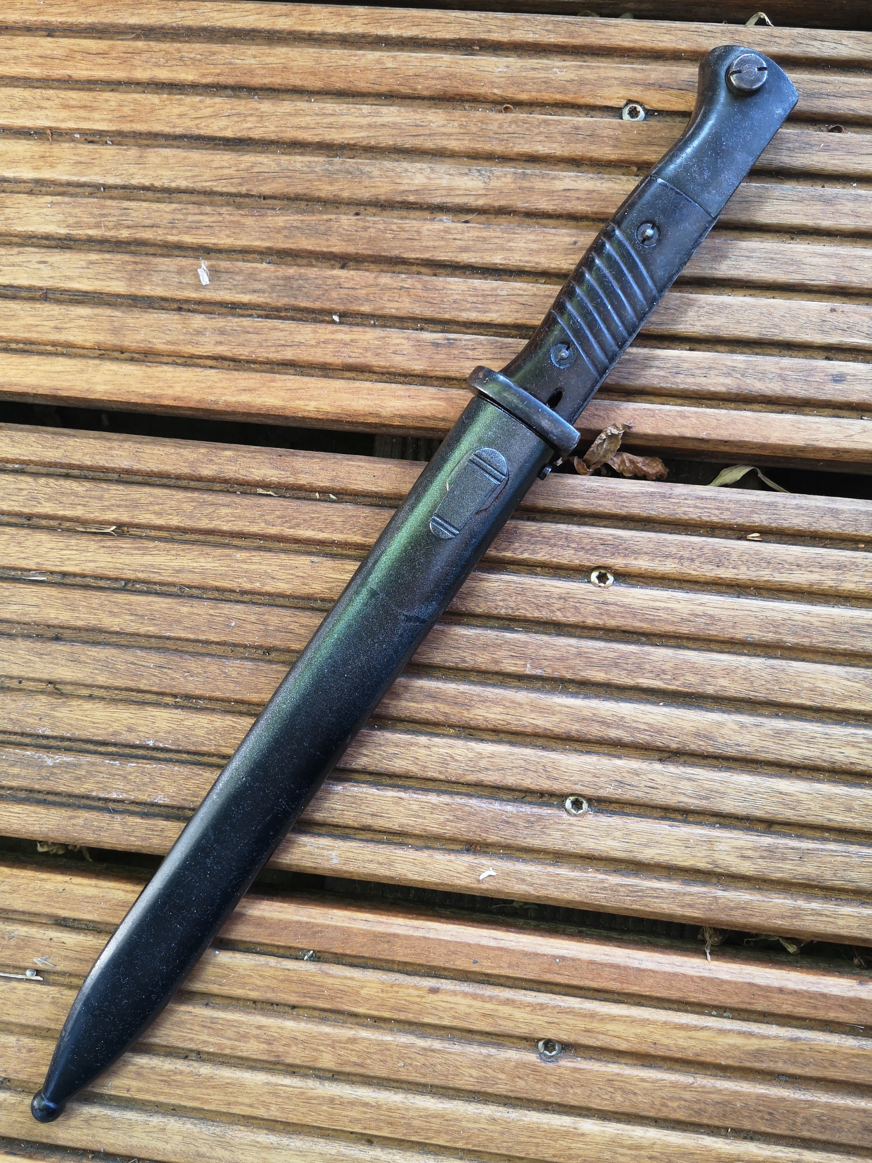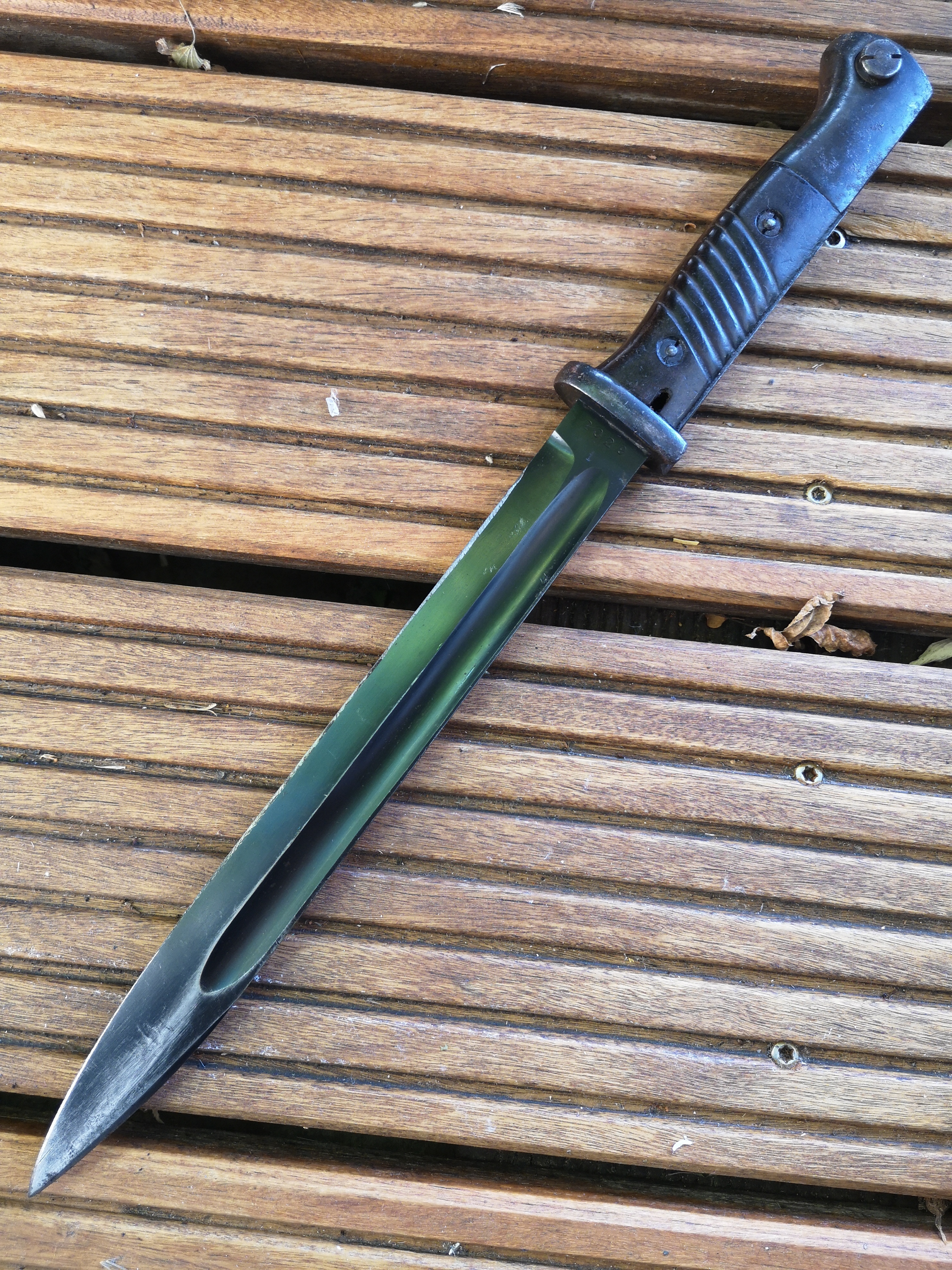 Ungereinigter Dachbodenfund: Bajonett 84/98 für den K98k. Bajonett gestempelt mit 41 cof; 2029 i und WaA883. Drücker innen 29 und WaA. Klinge geschärft.