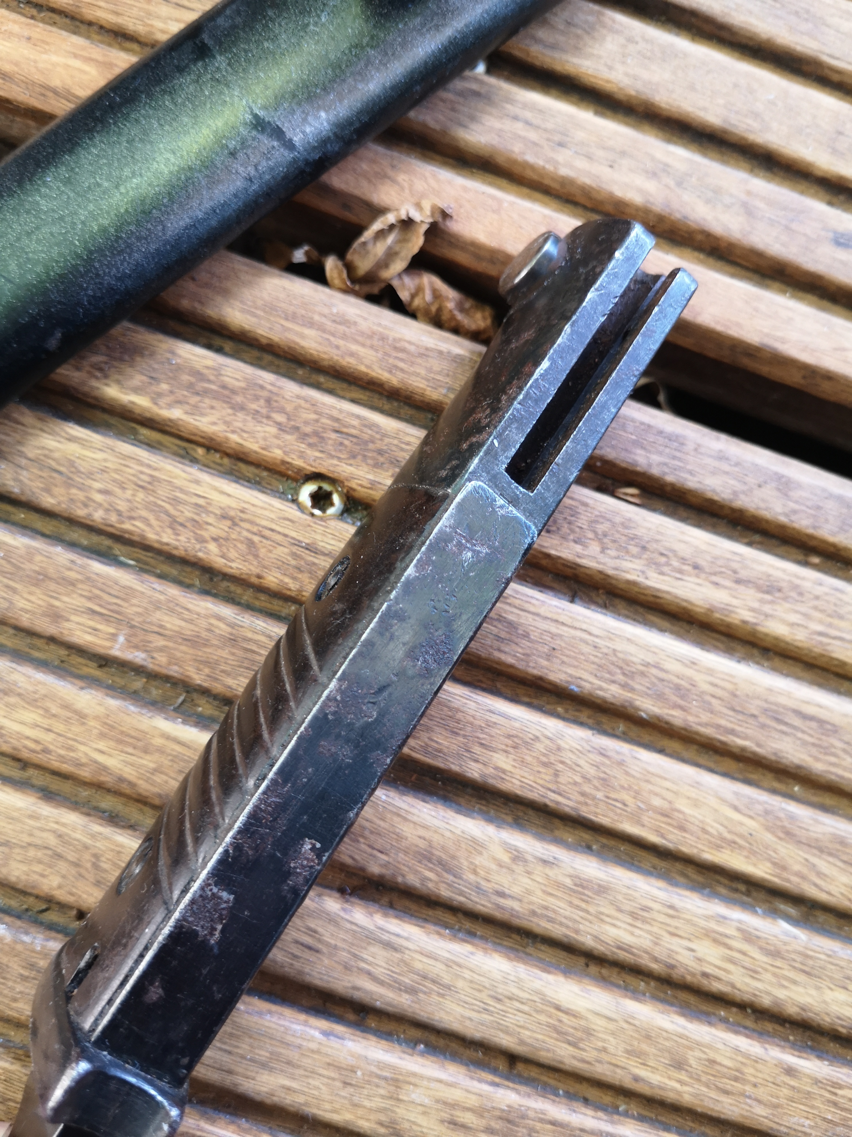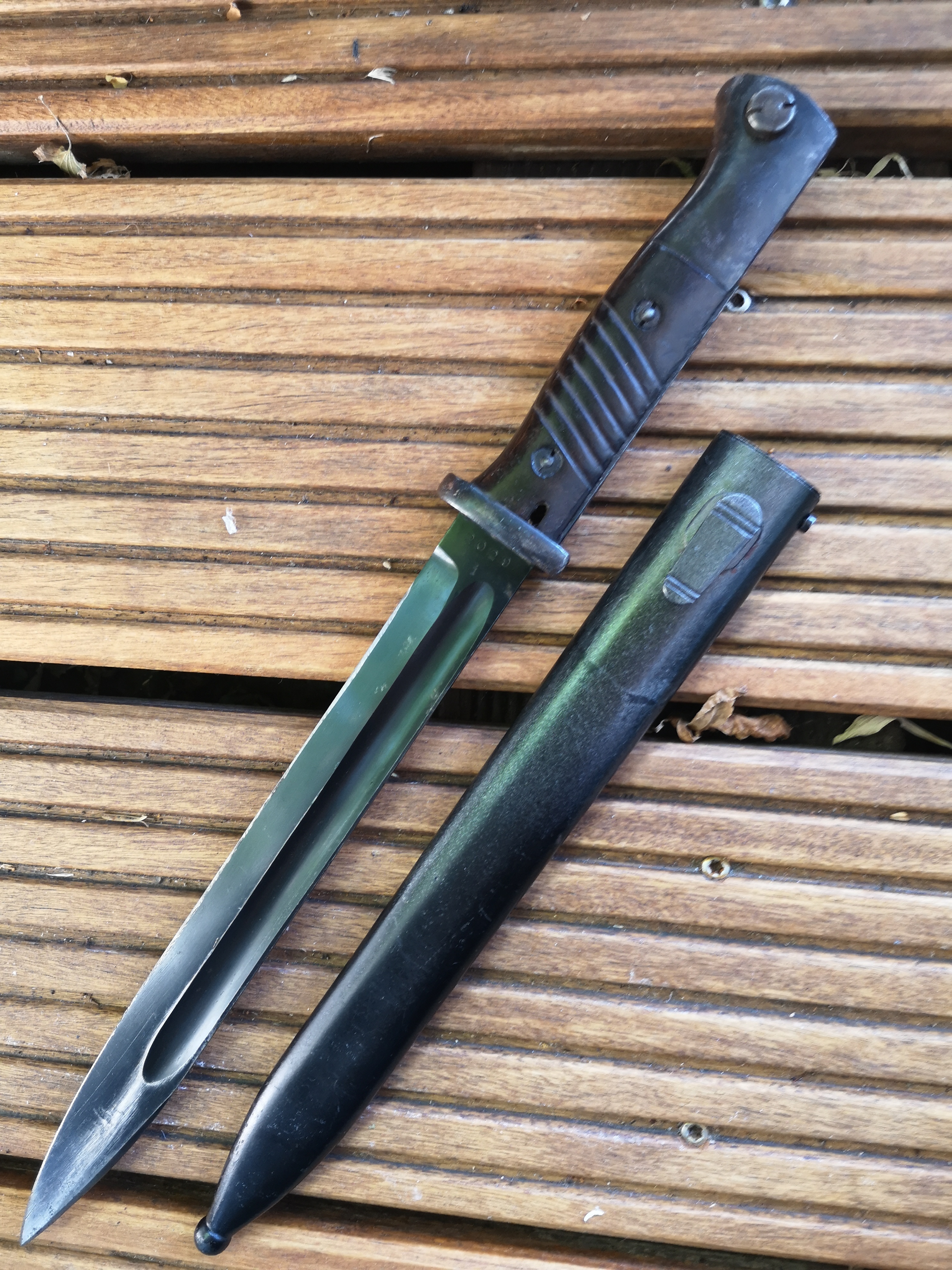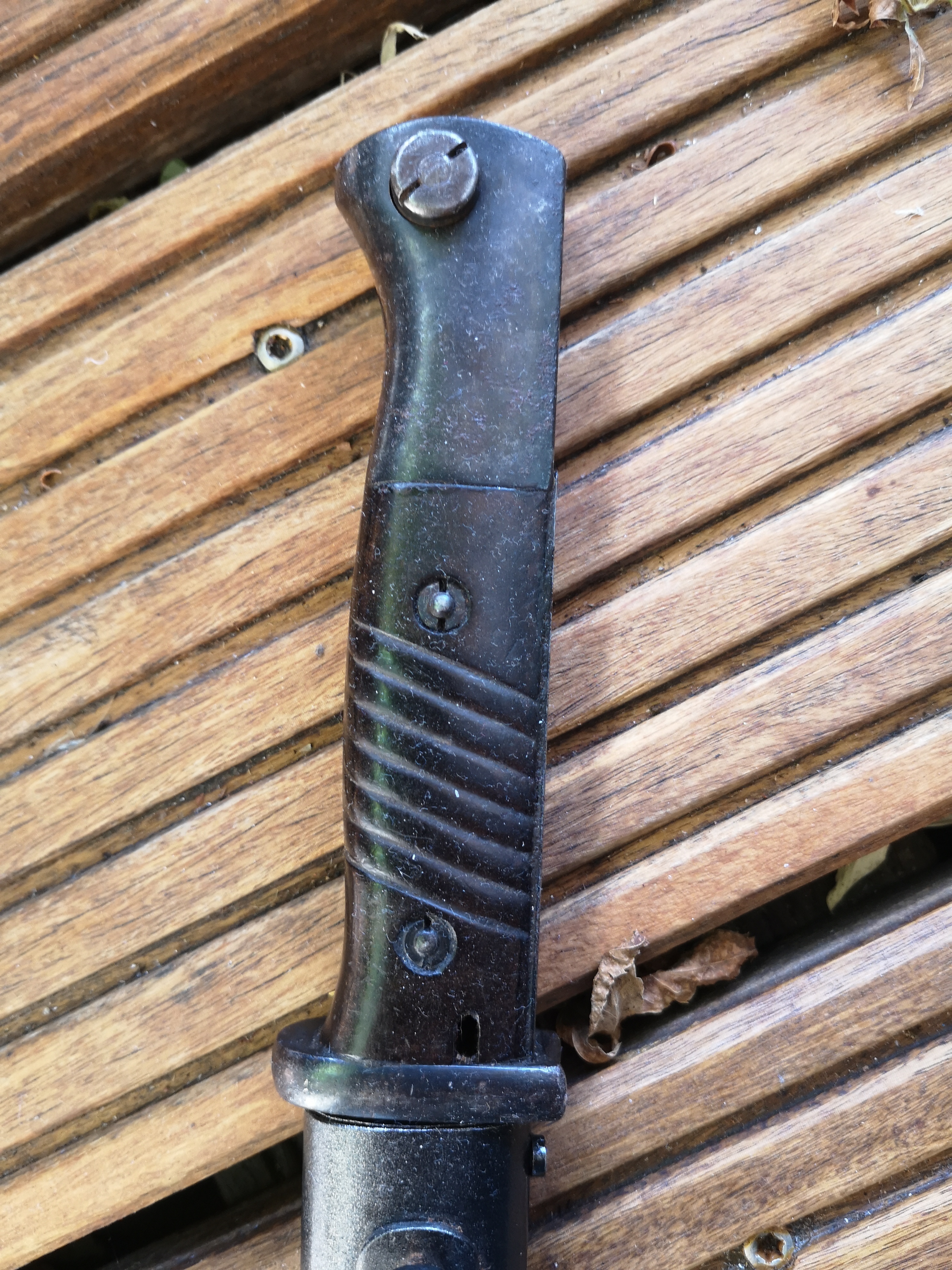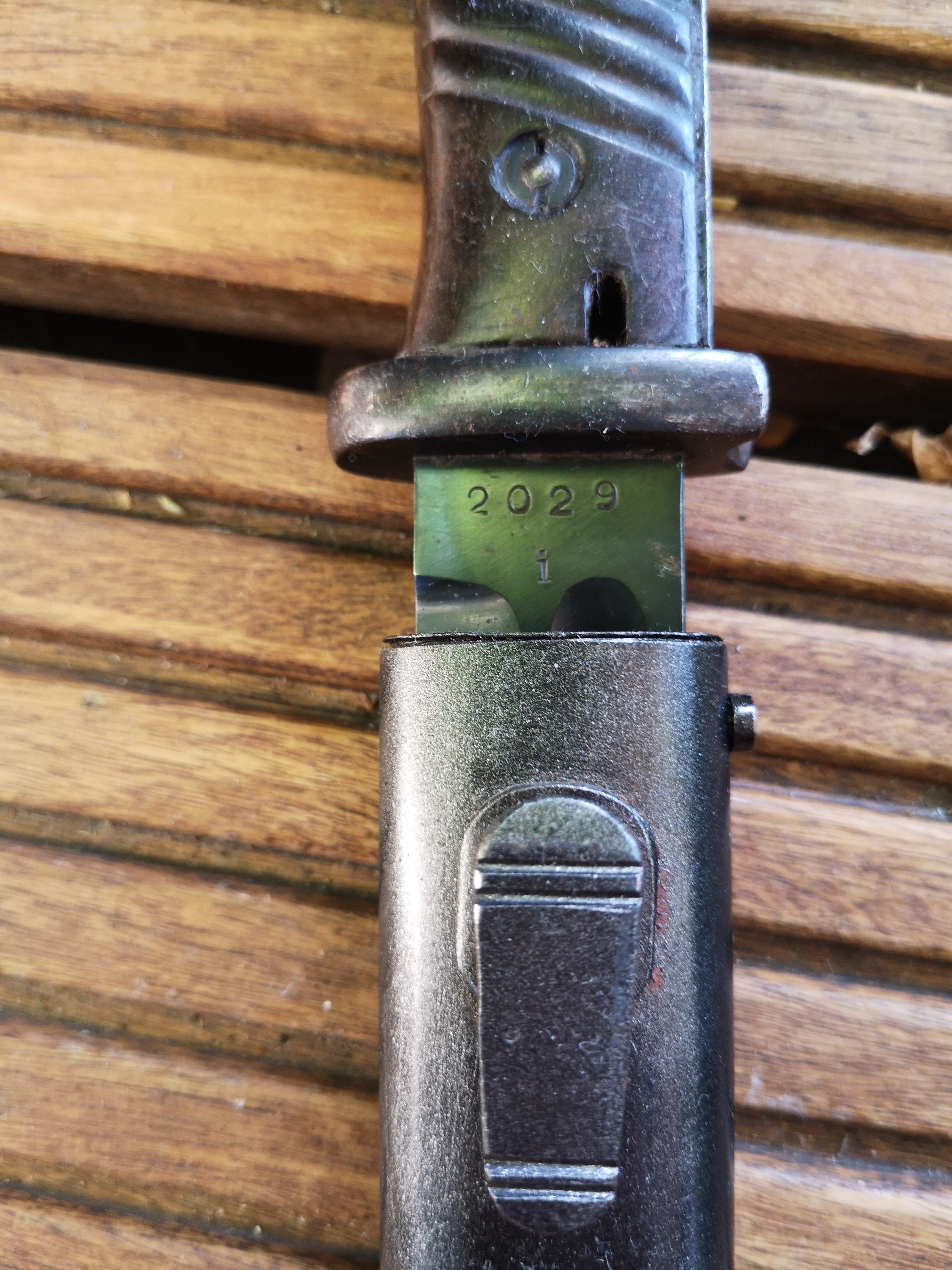 Ungereinigter Dachbodenfund: Bajonett 84/98 für den K98k. Bajonett gestempelt mit 41 cof; 2029 i und WaA883. Drücker innen 29 und WaA. Klinge geschärft.