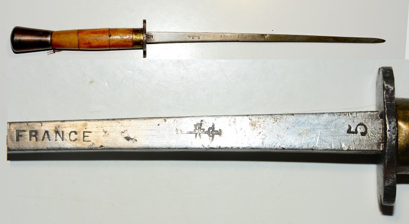 Französischer Behelfs-Grabendolch aus dem 1. Weltkrieg, wahrscheinlich aus einem Florett hergestellt, 25,2cm lange 4-Kant-Klinge, Klinge beidseitig gestempelt "France" "5" und Marke, die einen Degen zeigt, guter Zustand mit Altersspuren