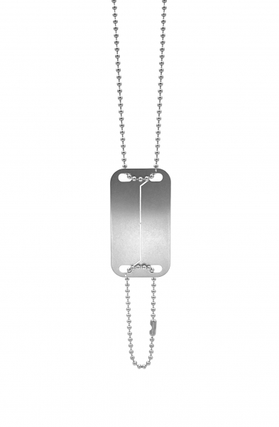Das besondere and dieser Erkennungsmarke ist, dass sie im Gegensatz zu allen anderen vertikal geknickt werden kann, was eine längliche Form erlaubt welche den Tragekomfort deutlich erhöht.