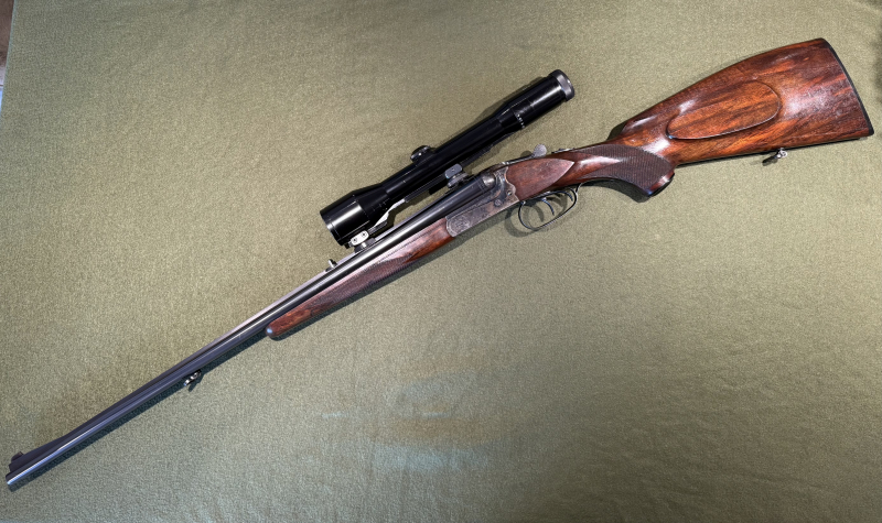 Verkaufe für einen Jagdfreund seine selten geführte Merkel Doppelbüchse im selten Kaliber von .308 Winchester. Die Waffe wurde sehr wenig geführt und ist im sehr guten Zustand wie auf den Fotos auch zu erkennen. Die Waffe schließt sehr stramm was auch auf eine geringe Schussleistung hinweist. Das Gehäuse ist Buntgehärtet. Montiert ist ein Zeiss Diavari in 1,5-6x42. Das Absehen ist klar und sauber. Die Läufe sind im sehr guten Zustand, Züge und Felder scharf zu erkennen. Die Schaftlänge bis zum vorderen Abzug beträgt ca. 36,5cm. Lauflänge ist 60cm. Der vordere Abzug ist mit Rückstecher ausgestattet. Die Waffe kann gerne vor Auktionsende besichtigt werden oder Fotos zugeschickt werden. Leider gehen nicht mehr als 6 Fotos. Auch eine Videoanruf ist möglich. Auf dem Lauf ist ab Werk der Schriftzug "Kersten NR.1 Cal.308Win." eingearbeitet. Die Waffe ist sehr angenehm zu schießen und sehr führig. Schussbild ist sehr gut!