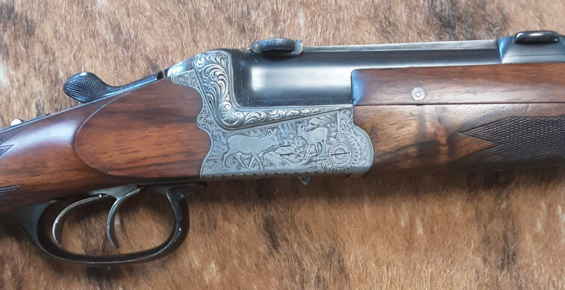 Gravur links Rehwild, rechts Gams, Unterseite Hirsch. Brünierung gut. Insgesamt sehr führige Bockbüchsflinte.