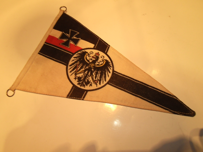 Kaiserreich Tischwimpel Reichskriegsflagge, bedruckter Wimpel 26 cm lang, Höhe 15,5 cm, am Abschluss oben und unten je 1 Ring.. Die fotografierte Seite ist verschmutzt, die andere Seite ist etwas sauberer.