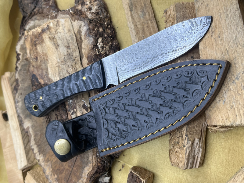 Typ: Handgefertigtes Damast-Jagdmesser aus über 200 Lagen. Volle Erl-Damastklinge. Holzgriff. Inklusive Lederscheide.