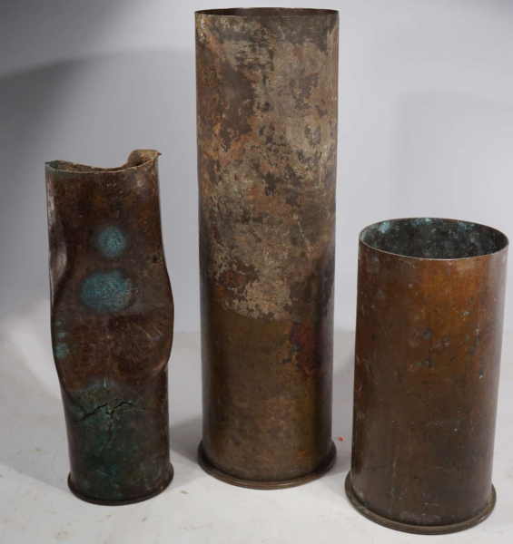 Artikel:2x Amerikanische Hülse 105mm (aus dem Jahr 1944) + 75mm (stark verdrückt) - 2. Weltkrieg