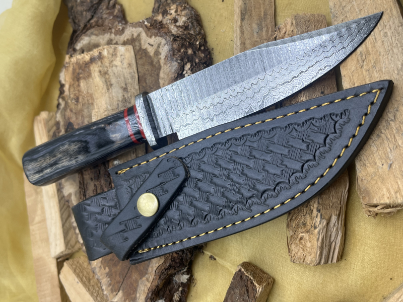 Typ: Handgefertigtes Damast-Jagd-Messer aus über 200 Lagen. Holzgriff. Damast-Parierstange. Inklusive Lederscheide.