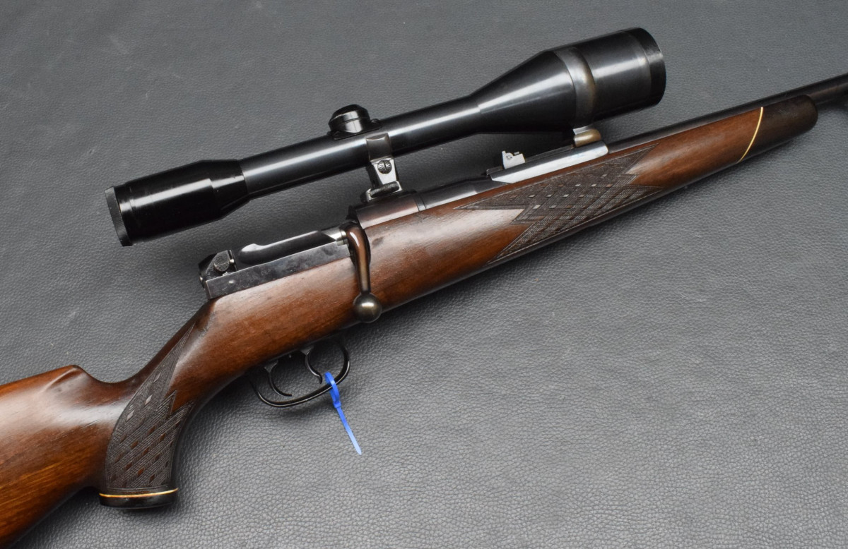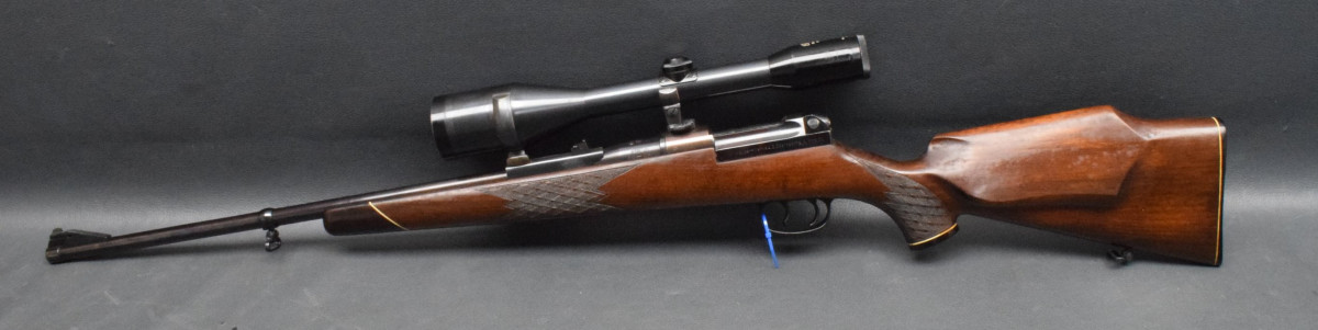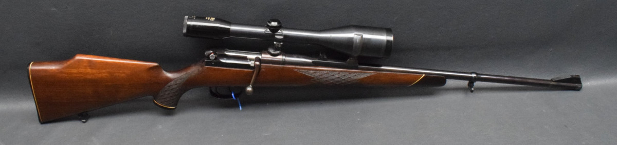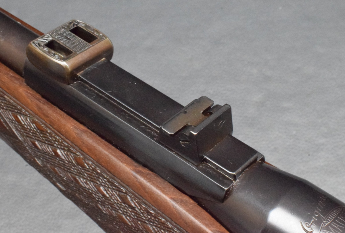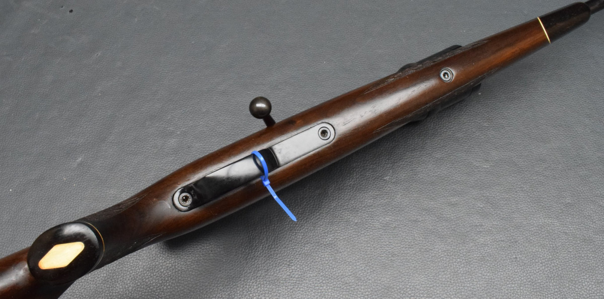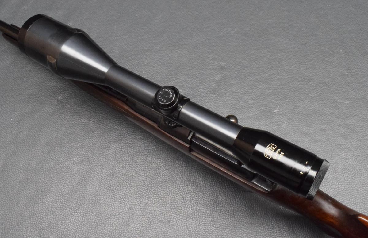 Nußbaumschaft mit bayrischer Backe, Edelholzabschlüssen, Kunststoffschaftkappe und Riemenbügeln.