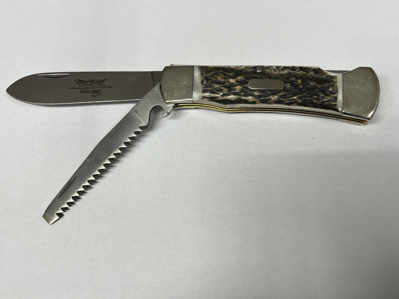 Hartkopf-Jagdtaschenmesser, Hirschhorn, Klinge 1.4110 Stahl, Säge 1.4034 Stahl, feststellbare Klinge, Neusilberbacken