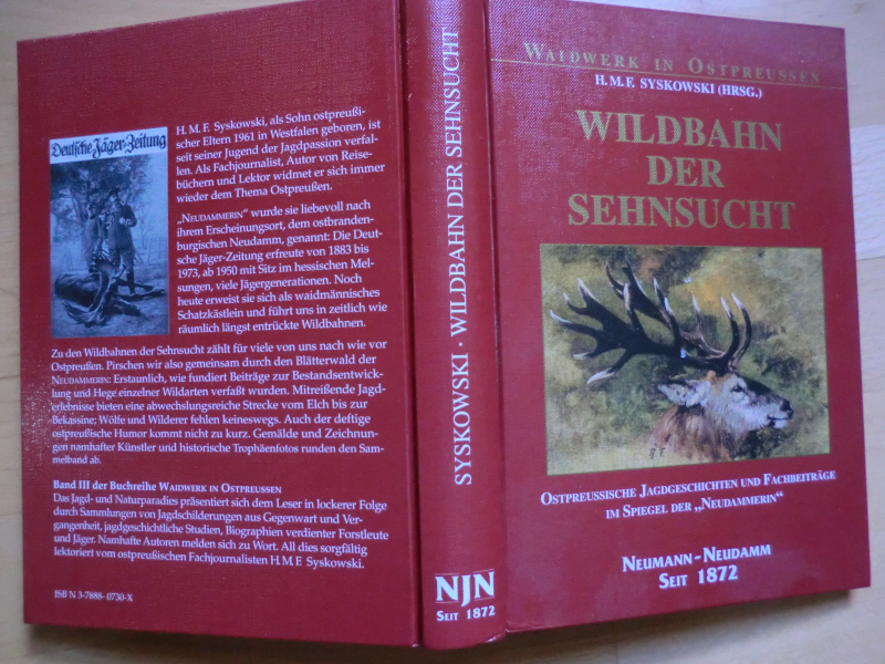 WILDBAHN DER SEHNSUCHT - Waidwerk in Ostpreußen - herausgegeben von H. M. F. Syskowski, Verlag Neumann-Neudamm 2002, 286 Seiten mit vielen Abbildungen und 3 Landkarten - Inhalt u.a.: Hindenburg / Unvergessenes Ostpreußen / Elchreise nach Ostpreußen / Vom deutschen Elch / Die Neuzüchtung des Auerochsen / Begründung des Rotwildstands in Masuren / Eine Hirschbrunft / Ostpreußenhirsche / Herr Wilddieb Ziegenspeck / Einiges über das Ansprechen / Der Düwel / Meine besten Böcke / Vom ostpreußischen Kleebock / Wolfsjagden in Ostpreußen / Auf den Kleinen Hahn / Der Hase meines Lebens / Wilkdschwäne / Im Pürschkahn / Entenjagd in Masuren / Auf schwarze Gesellen / Bunte Beute / und anderes mehr – Guter bis sehr guter Zustand