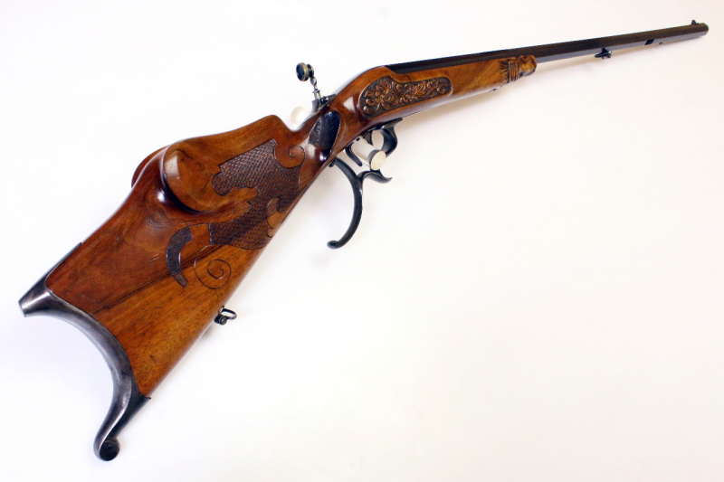 - Tiroler Nussholzschäftung, Schulterstütze, Daumenauflage, sehr schön beschnitzt, u.a. mit floralen Mustern, Schaftnase ausgeführt als Hundekopf, Riemenbügel