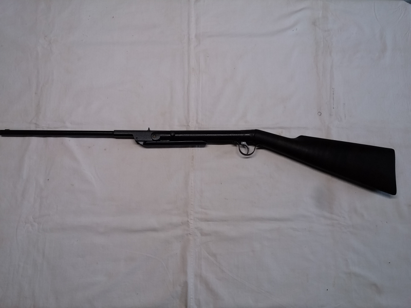 Angeboten wird ein uraltes Luftgewehr im Fundzustand, nur eingeölt. Metalloberflächen Rost (keine tiefen Narben). Spannen und abschlagen funktioniert.