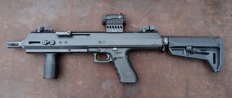Montiert war es auf dem Griffstück einer Glock 22 (Gen 4). Das Wechselsystem selbst ist jedoch im Kaliber 9mm und verfügt über einen 10 Zoll Polygonlauf mit Gewinde.