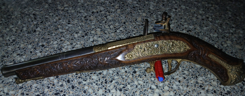 Steinschlosspistole im sehr guten Zustand. Lade und Feuerraste Funktion gegeben. Feuerstein funkt ordentlich. Batterie neu besohlt. Federn stramm. Cal 50