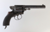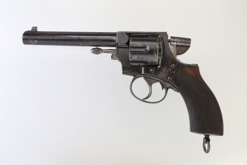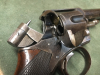 Silver & Fletcher-PATENT-Selbstauswerfer-Revolver auf Basis Webley-R.I.C.-Revolver; Kal. .450; 6-schüssig; mechanische Funktion einwandfrei; S/N 34621 von Webley, Nummer 218 von Silver & Fletcher; Laufschiene/Rahmenbrücke: Silver & Fletcher's Patent THE EXPERT; S.W. SILVER & CO CORNHILL LONDON; Hahn: PATENT; Birminghamer Beschuß. Das Silver & Fletcher-System ist ein Mechanismus zum Auswerfen der abgeschossenen Patronenhülsen. Zu diesem Zweck wurde der Trommelumfang am hinteren Rand etwas eingefräst, so dass ein kleines Segment des Hülsenrands für eine Auszieherkralle zugänglich wird. Beim Betätigen des Abzugs schlägt der Hahn auf die kipphebelförmige Verlängerung dieser Klaue und wirft die leere Patronenhülse aus. Dazu muß natürlich die Ladeklappe offen bleiben. Um keine noch nicht abgefeuerte Patrone auszuwerfen, muß zwingend eine Trommelkammer leer bleiben. Wenn die mit 5 Schuß geladene Trommel leergeschoßen ist, kann sie dann aber sofort wieder geladen werden. Bei geschlossener Ladeklappe ist die Funktion wie die eines normalen Revolvers. Ein weiterer Teil des Patents bezieht sich auf eine Sicherungsvorrichtung, die nach einer Vierteldrehung den Zündstift des Hammers von der Patrone fernhält.