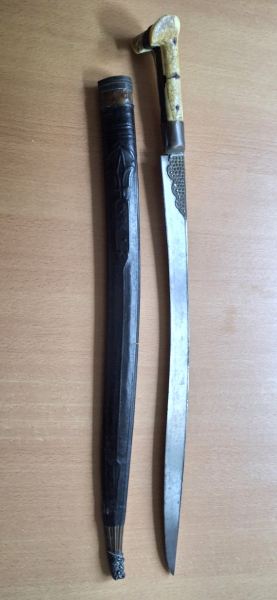 Die Klinge mit Griff ist 68cm lang,der Griff aus Horn. Die Scheide 61cm. und besteht aus Holz mit Kupfer und