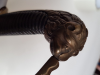Biete Ihnen diesen alten Säbel , ohne Scheide an . Meiner Meinung ein Husaren Säbel um 1800 . Das Griffstück ist aus Messing mit einem Löwenkopf und das Griffstück ist beledert . Der Säbel hat eine extrem biegsame Klinge ! Die Klinge ist beidseitig im oberen Drittel mit schönen Gravuren versehen . Eine leichte Gravuren Vergoldung ist noch erkennbar . Auf der einen Seite ist die Klinge mit - G.W. - , als Hersteller markiert . Im oberen Drittel ist die Klinge ca. 3,5 cm breit . Klingenlänge ca. 84 cm . Gesamtlänge des Säbels ca. 98 cm . Im unteren Drittel sind einige Narben vorhanden ! Beeindruckt hat mich immer die extrem biegsame Klinge !