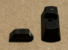 Eine stählerne Visierung Kimme und Korn für Pistolen CZ75B original CZ (Prägestempel) in der Ausführung mit (altersbedingt inzwischen schwächer) nachleuchtender TRU DOT Punkte. Unmontiert, die weissen Punkte sind tagsüber sowieso einwandfrei erkennbar und in Dunkelheit ständig schwach glimmend. Korn in der Ausführung für verstiftete Schwalbenschwanzführung.